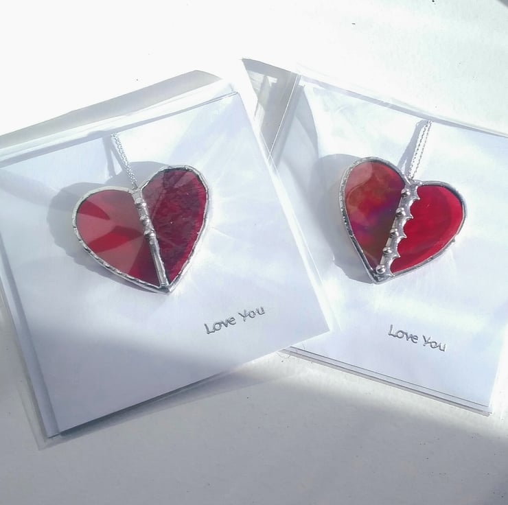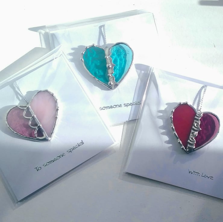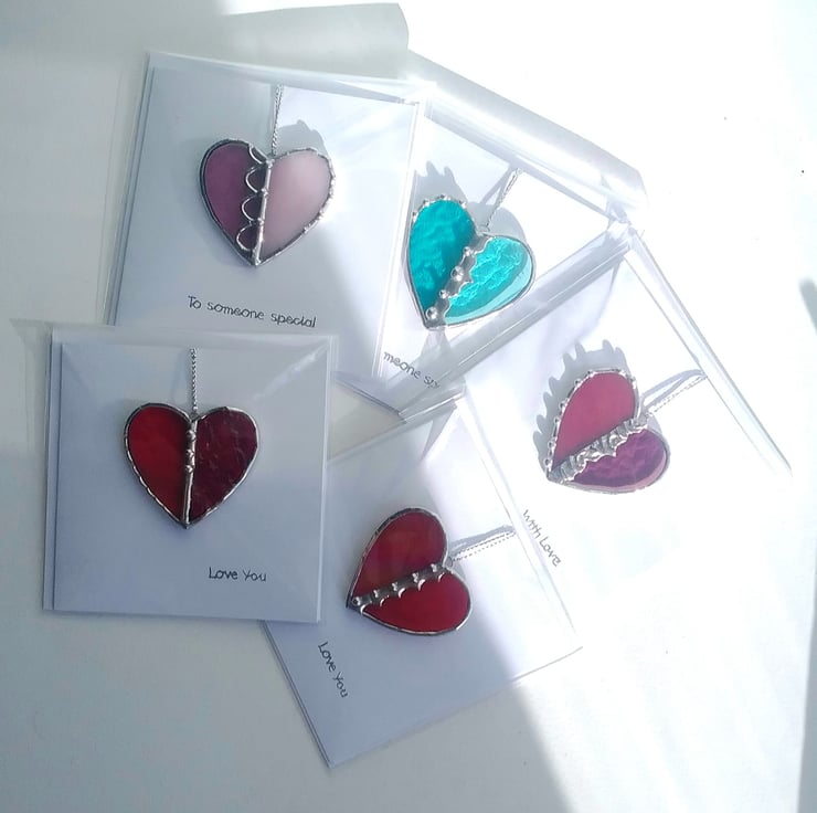 Each little heart is handcrafted from the finest quality stained glass finished with polished solder details and a silver sentiment. Blank inside for your own Winter wishes. Envelope included.