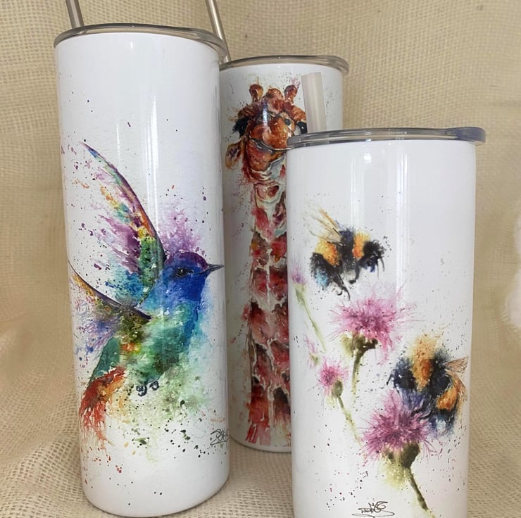 This double-wall, vacuum-insulated tumbler is designed to keep your drinks hot or cold. They have a rubber-sealed, leak-proof lid and a stainless steel straw. They are printed with a choice of stunning watercolour paintings from our wildlife collection.