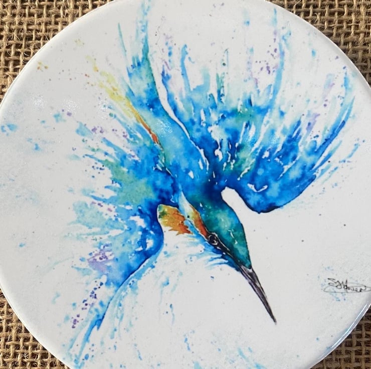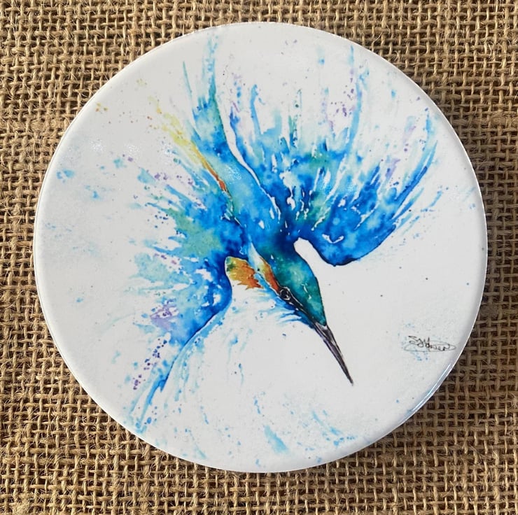 Kingfisher Ceramic Coaster with Cork Base, Large 10cm Round Coaster. From a Wate