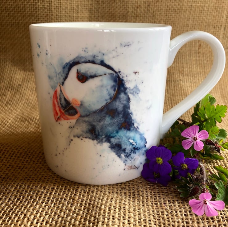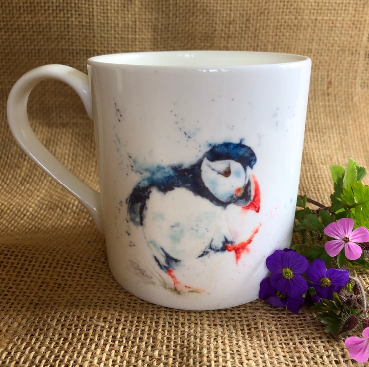 Puffins Watercolour Bone China Mug, China Cup, Gift, Wildlife Art Mug by Waterco