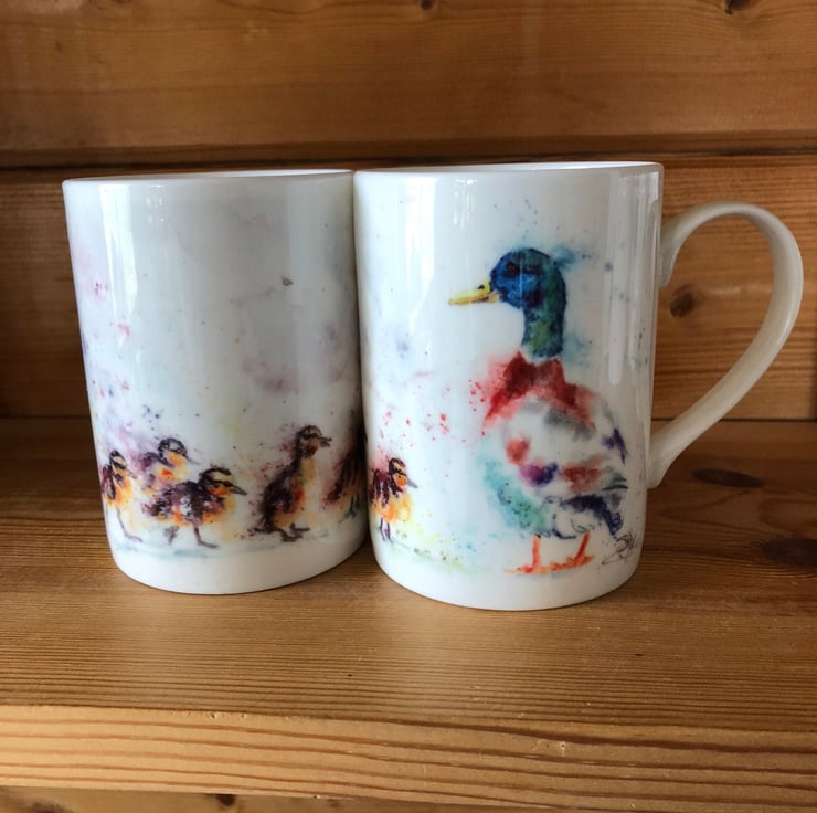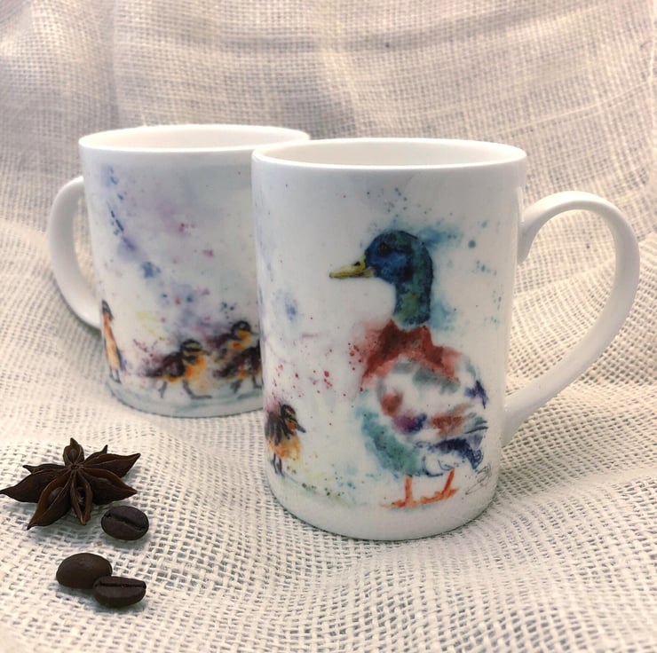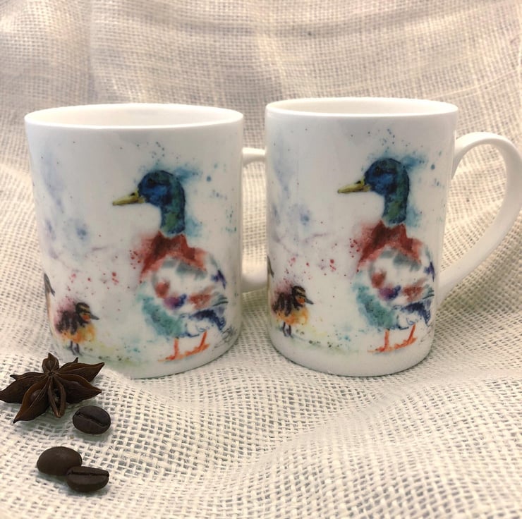Mallard Ducks Watercolour Bone China Mug, Wildlife Art Cups by Artist Sandi Mowe