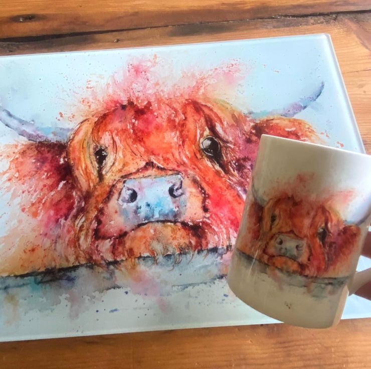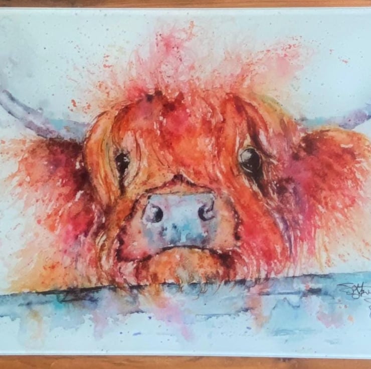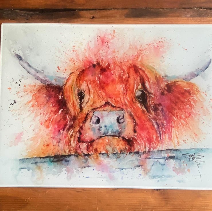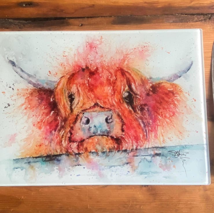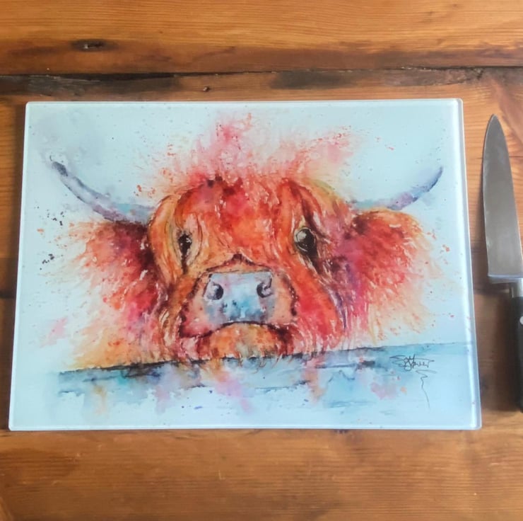 Highland Cow, Dougal. Glass Chopping Board, Kitchen Worktop Saver. From a Waterc