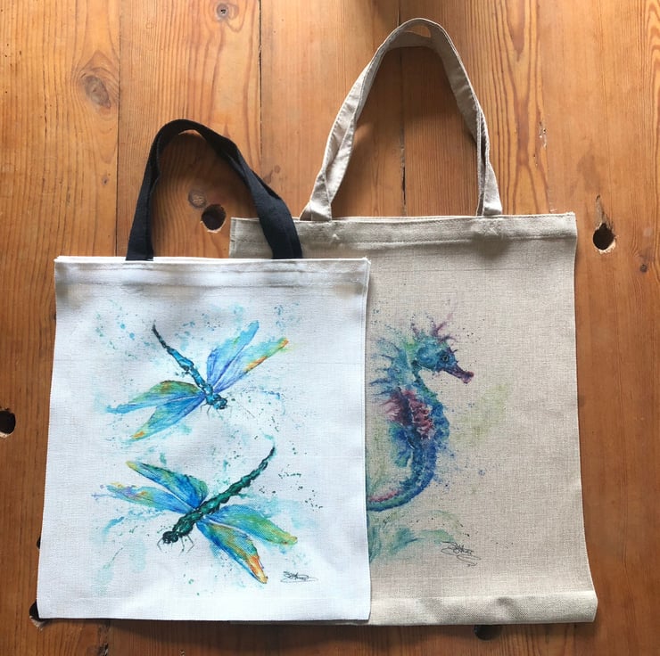 Choose from either the black-handled linen look bag or the larger, longer-handled jute look bag. Both are made from super heavy-weight quality fabric and are strong, hard-wearing tote bags that make the perfect gift. Each bag is printed by myself with a design from my original watercolour paintings.