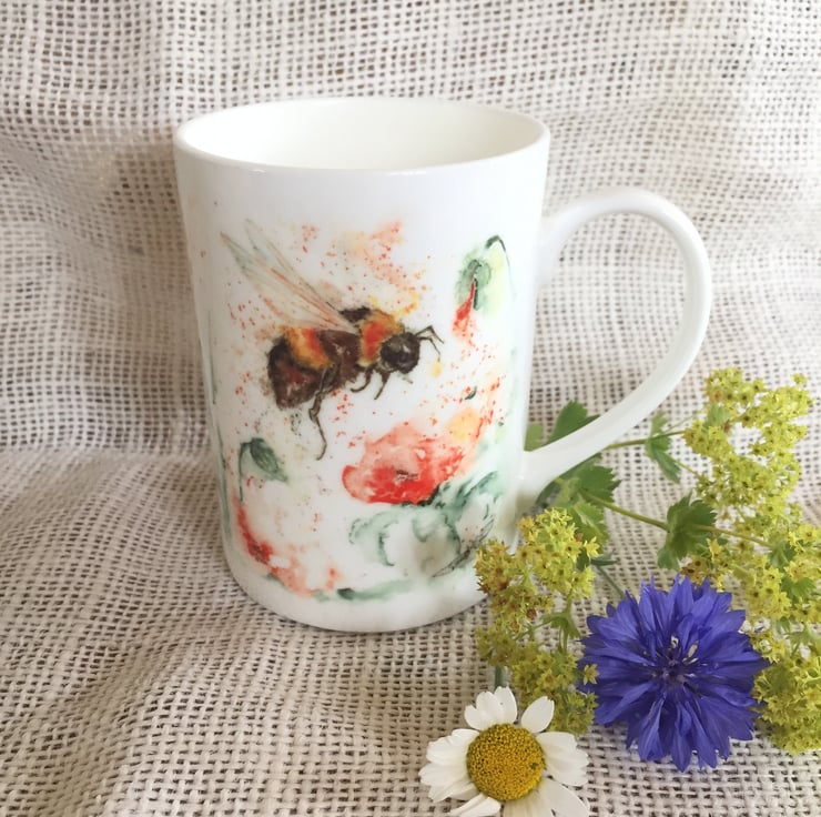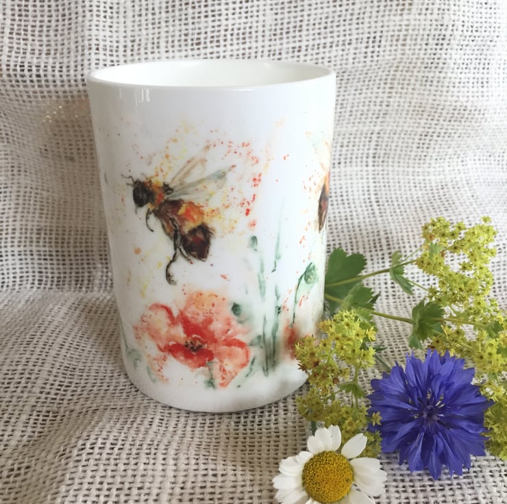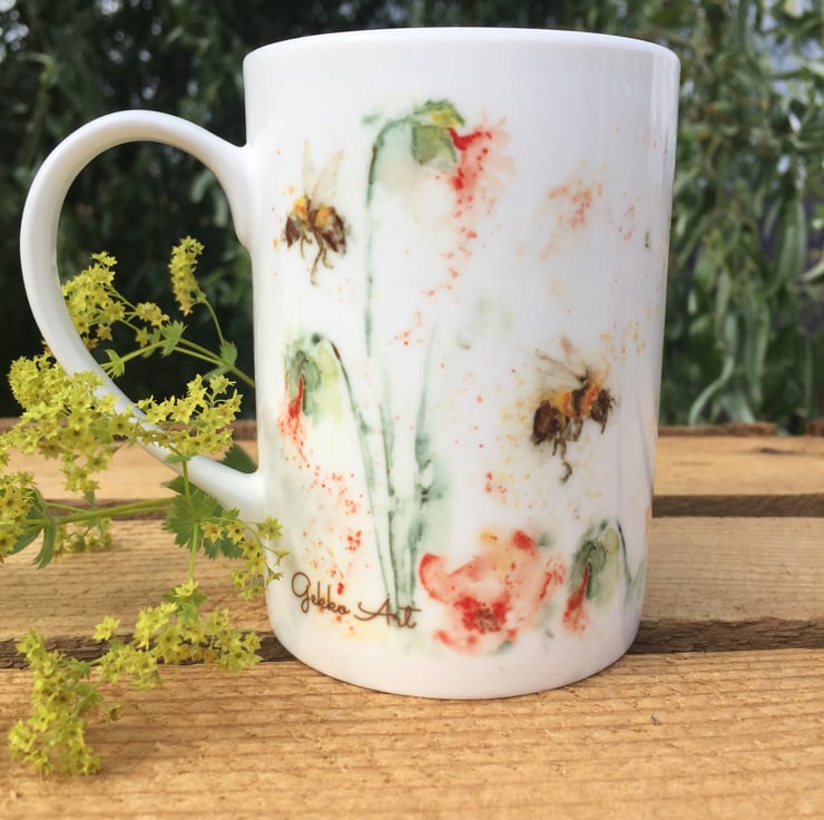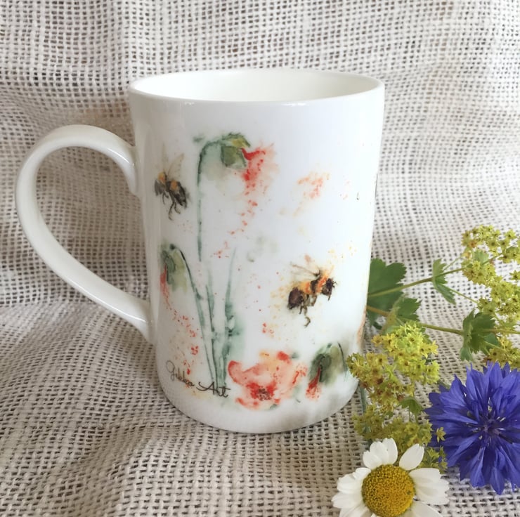 Poppy Bees Watercolour Bone China Mug, China Cup, Wildlife Art Mug by Artist San