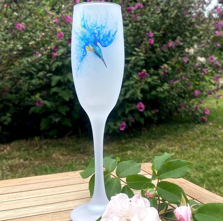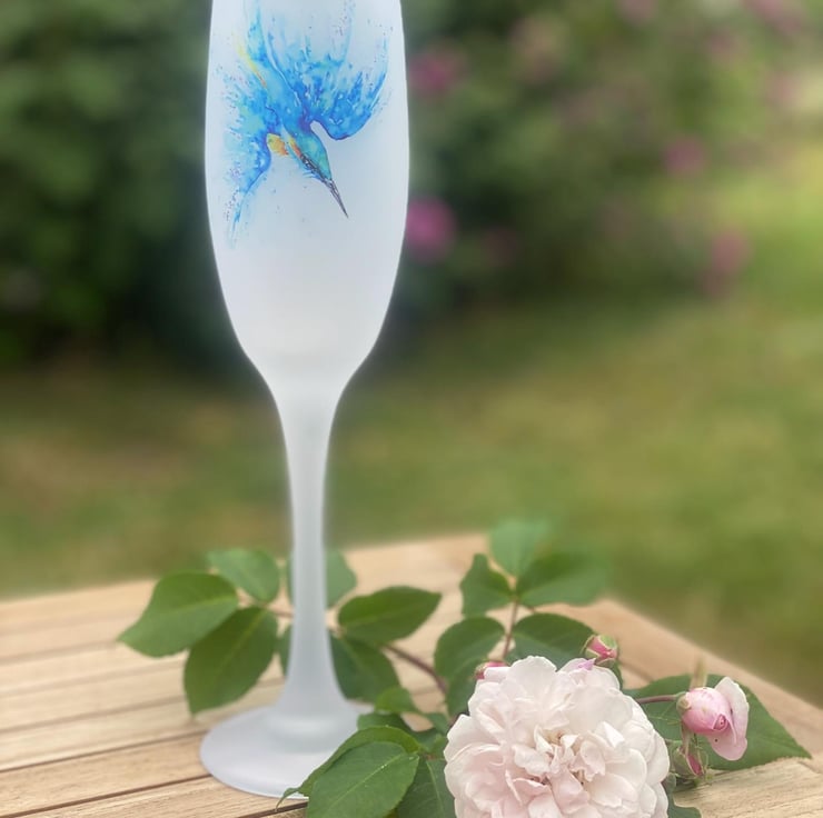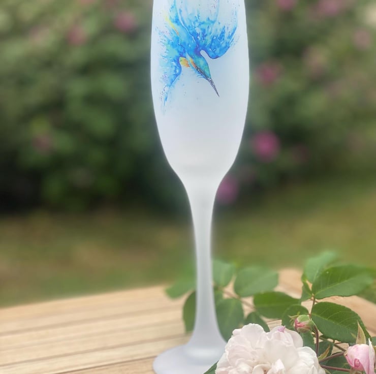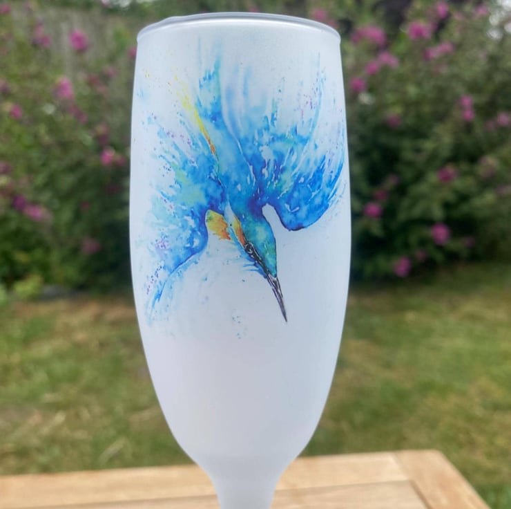 Kingfisher Watercolour Motif, Frosted Glass Champagne Flute, Prosecco Glass. By