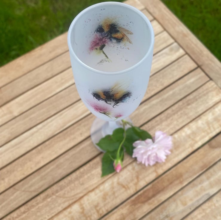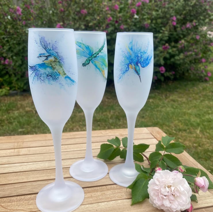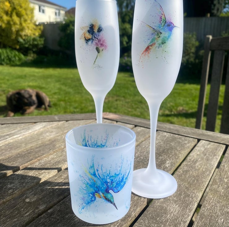 Frosted glass champagne flutes with a colourful wildlife watercolour design printed on both sides. These gorgeous flutes hold 190ml, or 6oz, of your favourite fizz and stand 24cm high, with a 5cm diameter. They have a nice weight to them, so they don't feel too fragile, but due to the frosted surface, they should only be washed by hand.