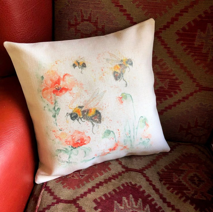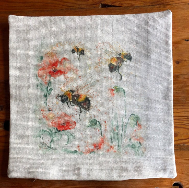 Poppy Bees Cushion Cover, Wildlife Art Cushion, Bee Watercolour Textile Print, L