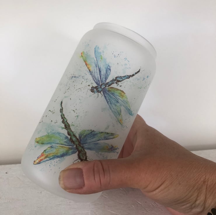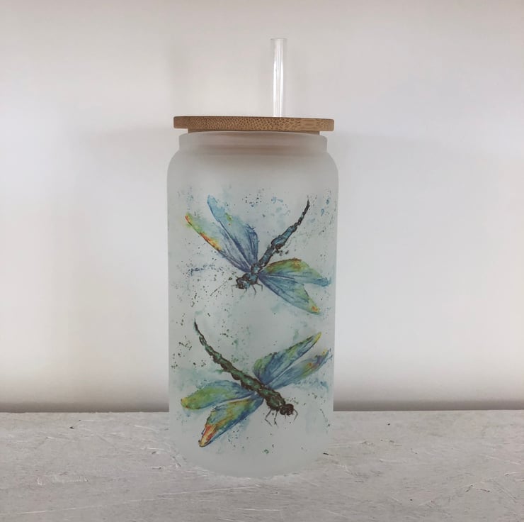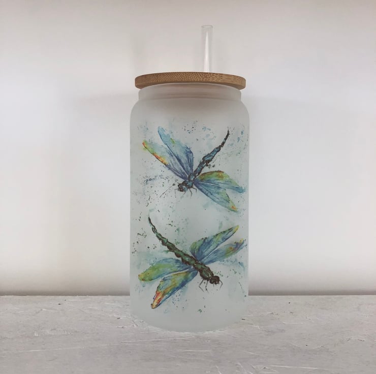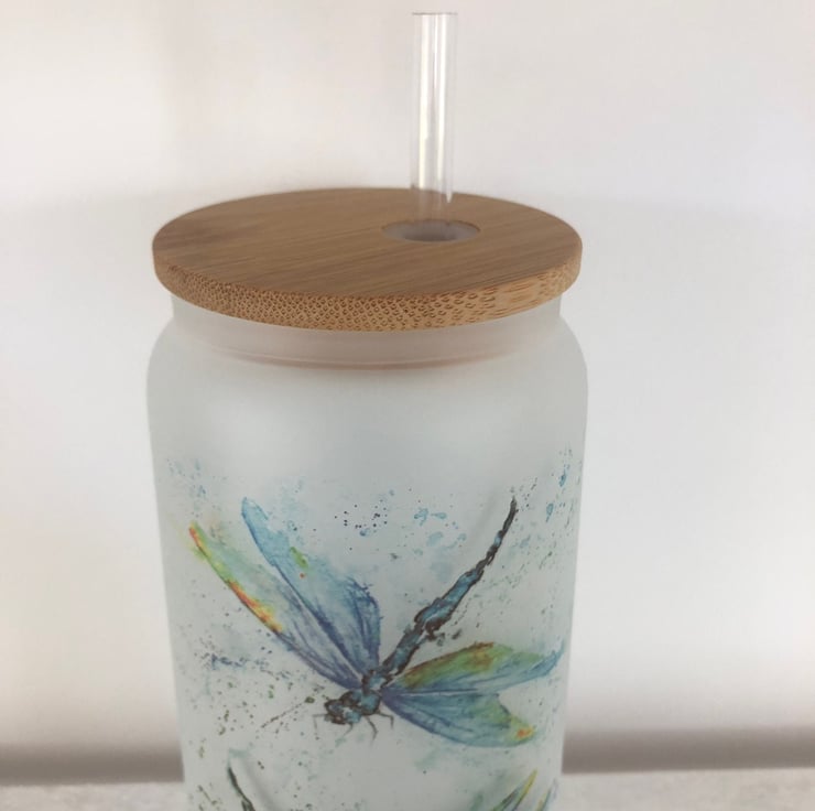 Dragonfly Frosted Glass Tumbler with Bamboo Lid & Straw, 500ml Can Drinks Glass.