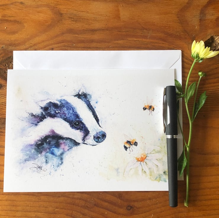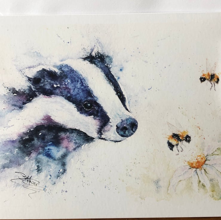 A lovely quality A5 greetings card with a stunning badger design from my original watercolour painting named 'Badgering the Bees'.