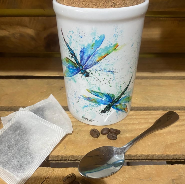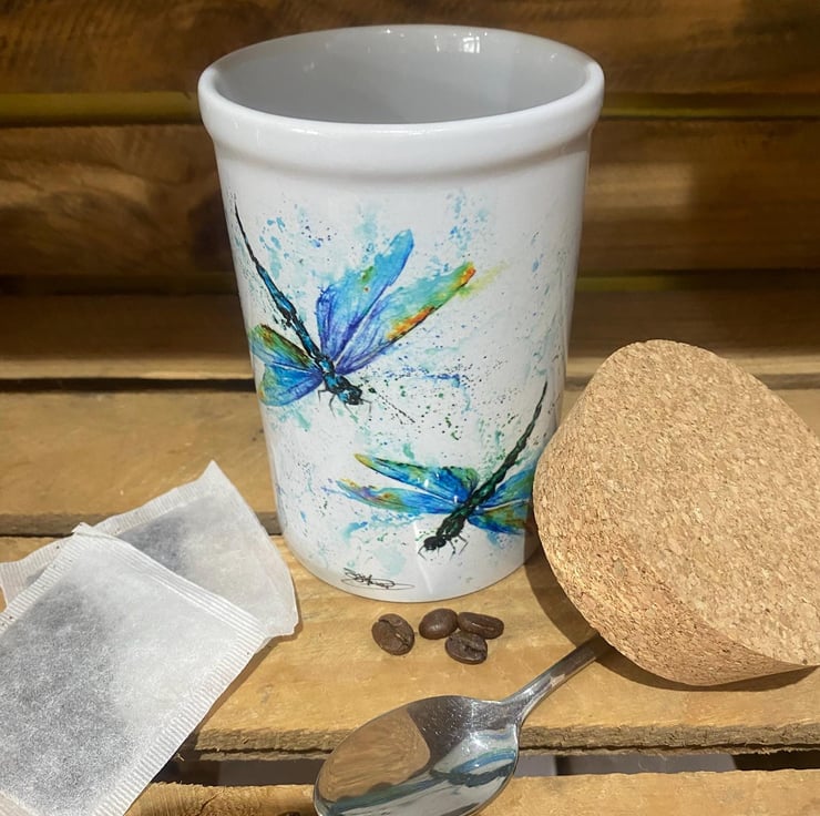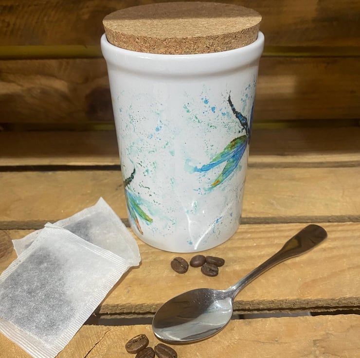 This ceramic storage jar is ideal for tea, coffee and sugar, and handy as a dressing table or bathroom tidy too. It holds 15 ounces (UK imperial measure) and has a cork lid. The jar measures 13cm high x 9cm in diameter. The ceramic jar has been printed in my studio in Somerset with a design from one of my original watercolour paintings. It will be sent securely wrapped in recycled bubble wrap in a cardboard box.