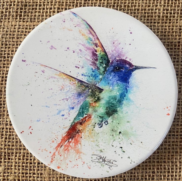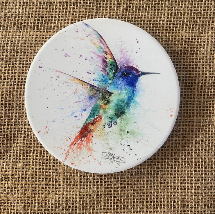Hummingbird Ceramic Coaster with Cork Base, Large 10cm Round Coaster. From a Wat
