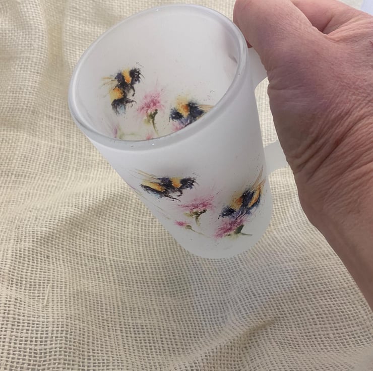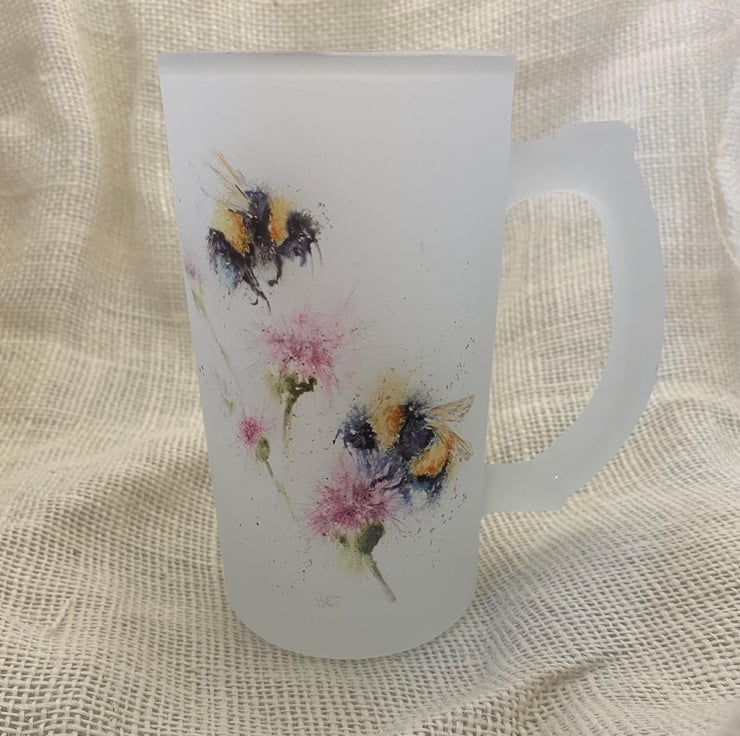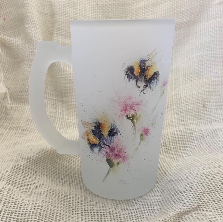 Bumblebee & Thistle Frosted Glass Tankard, Beer Stein, 500ml Drinks Glass with H