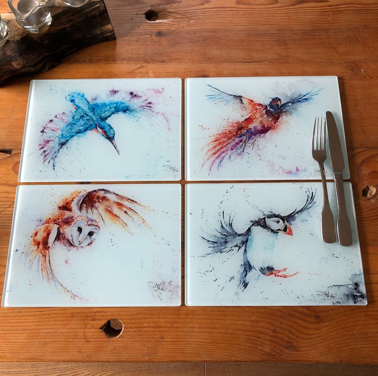 A glass placemat with a smooth surface and beautiful animal artwork from my original watercolour paintings.