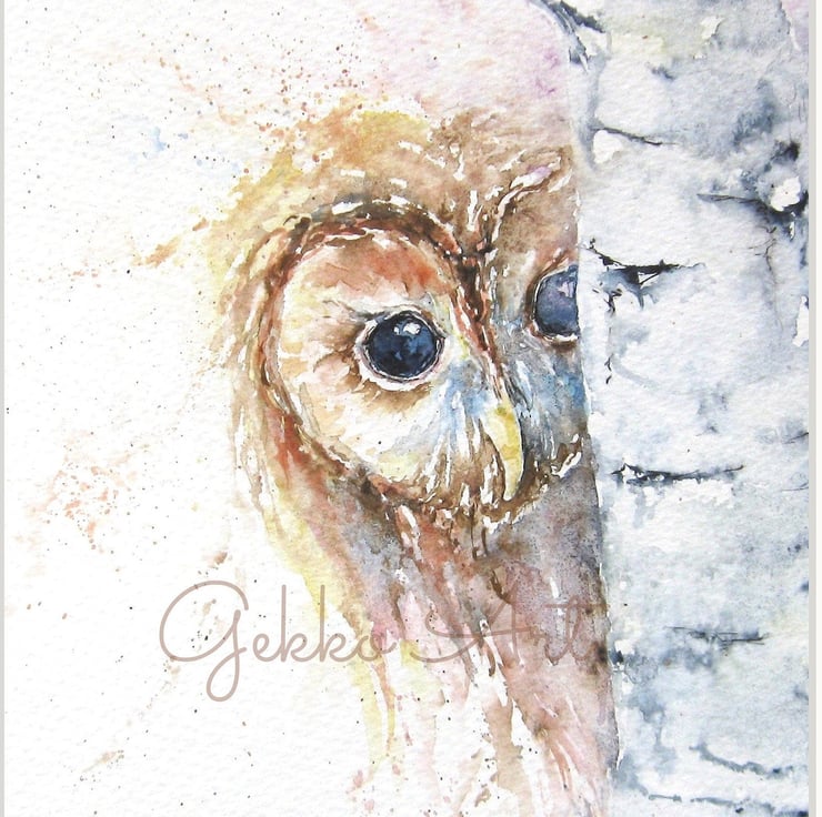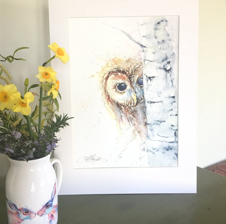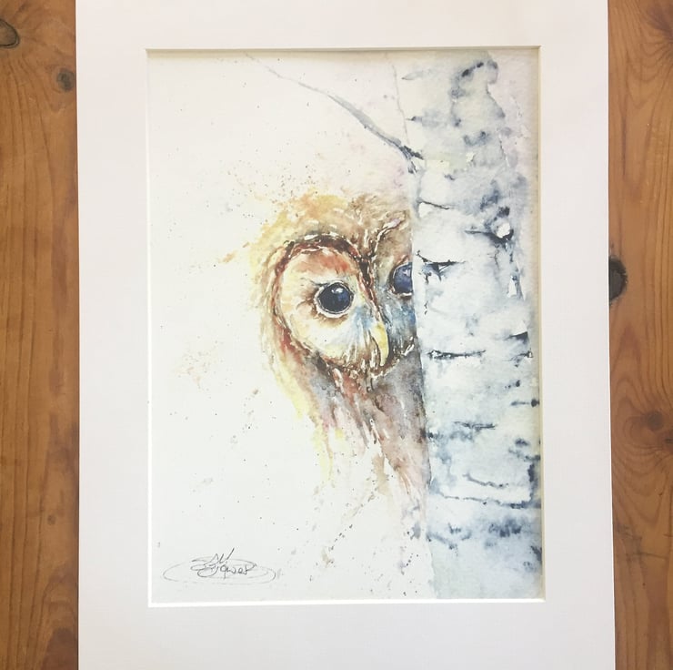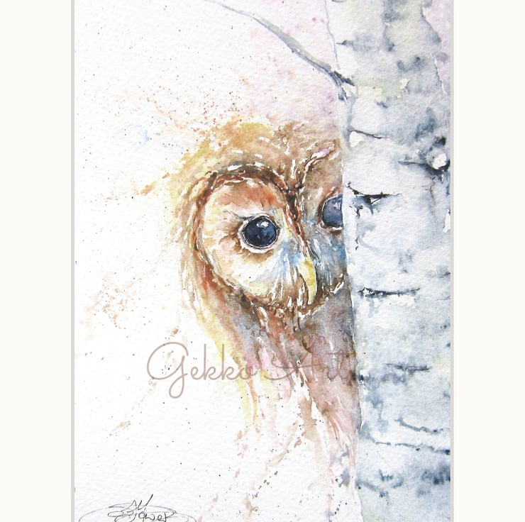 This is an archival quality fine art print from my original painting of a Tawny Owl named 'Peek-a-Woo'.