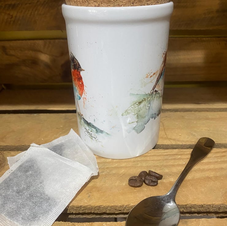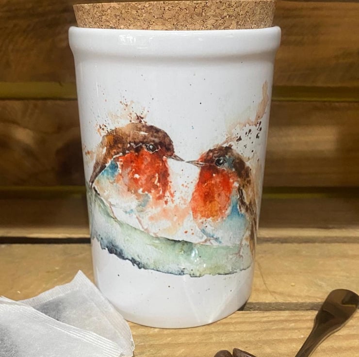 Robins Kiss Watercolour Ceramic Storage Jar with Cork Lid, by Artist Sandi Mower