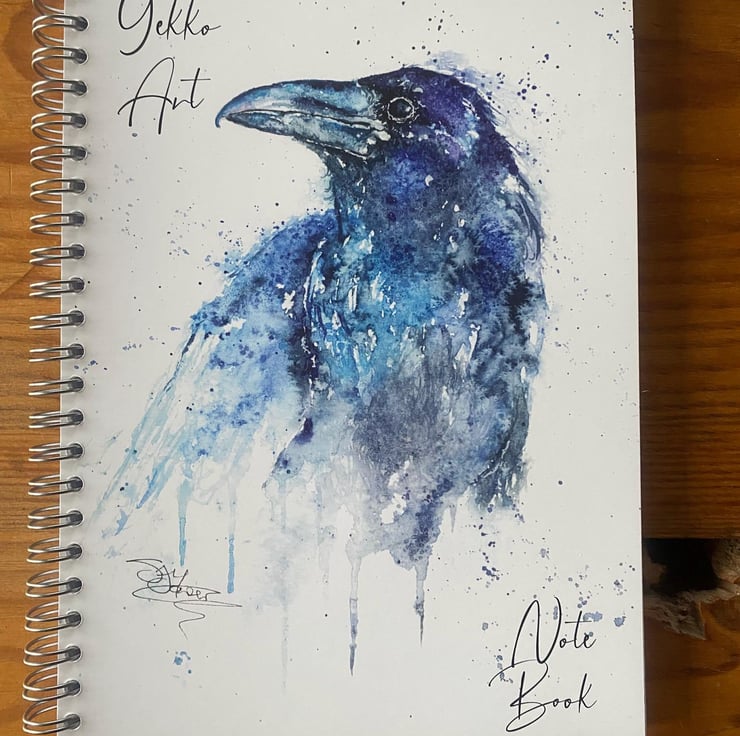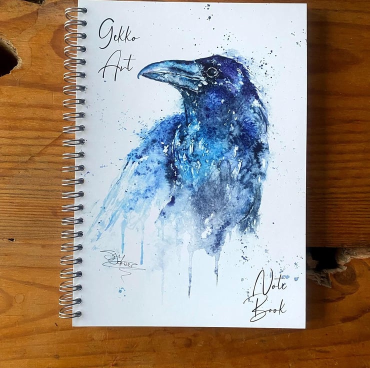 A lovely quality A5 notebook with a spiral binding and protective clear plastic front & back cover with a Raven design from my original watercolour painting named 'Beguiling'.