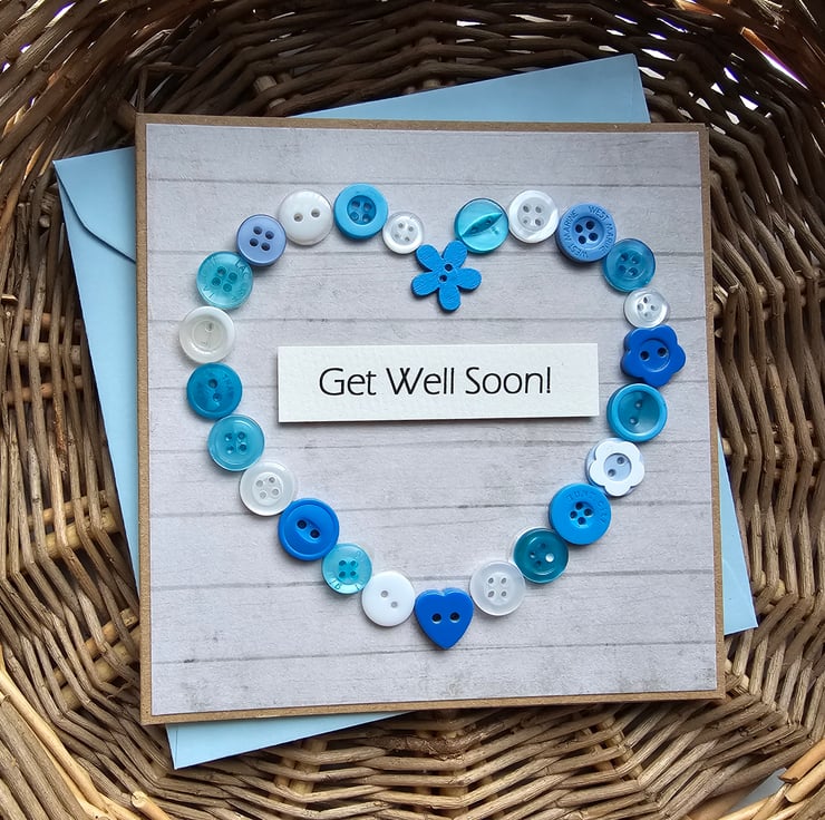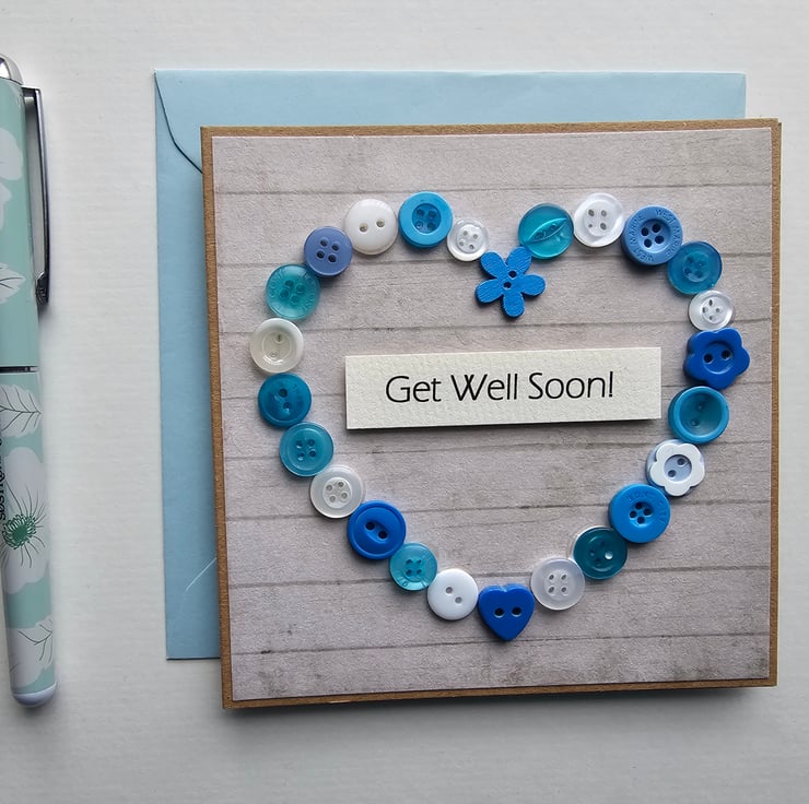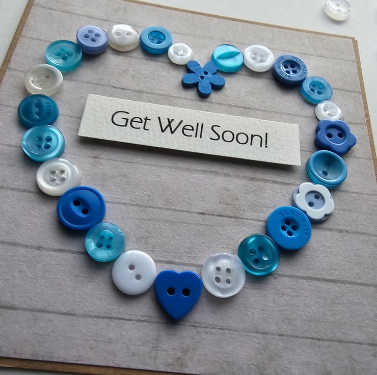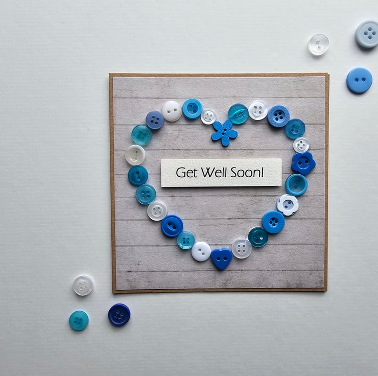 Blue Buttons Heart Get Well Card Size 5" x 5" (12.5cm x 12.5cm)