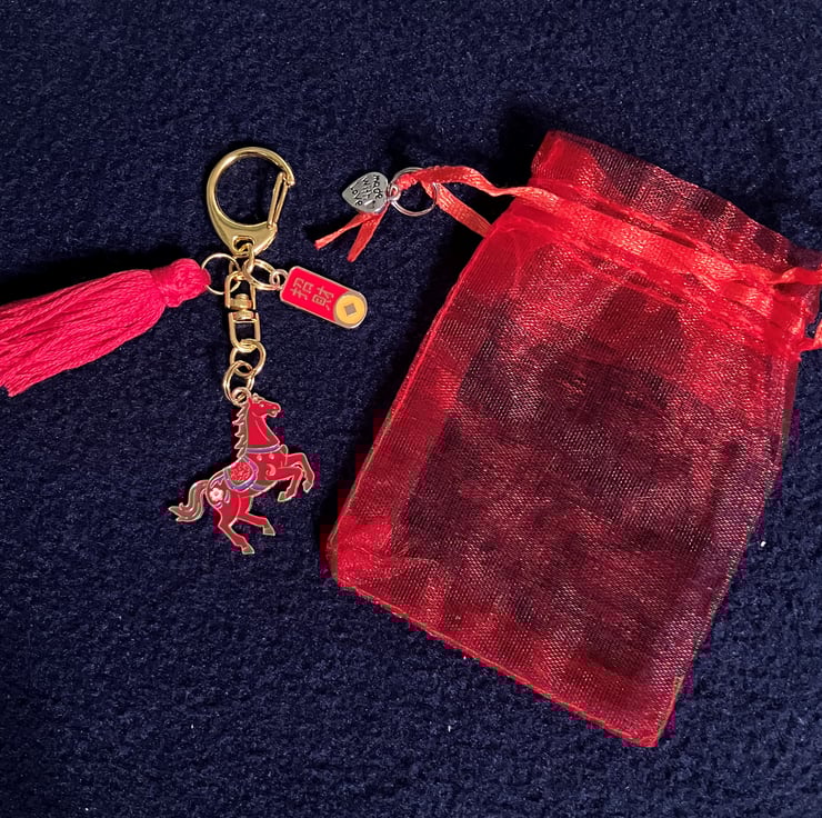 The Fire Horse charm has red, green and yellow enamel on the front. The back is gold tone embossed metal.