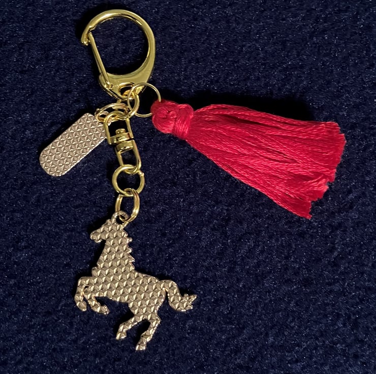There is a red handmade tassel attached to the bag charm. The tassels are made from red embroidery floss and are held together at the top with a metal ring.