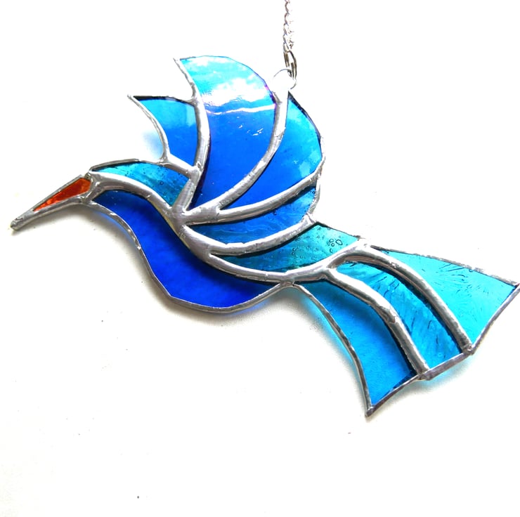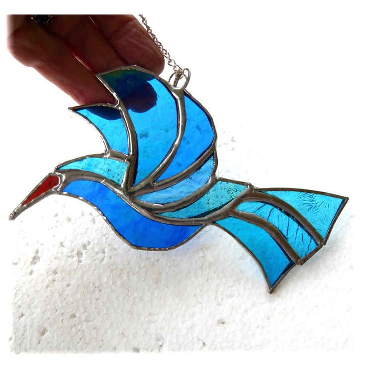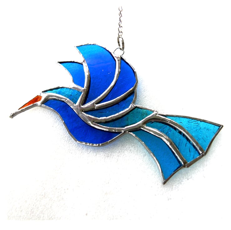 The bird hangs 11.5 x 15cm from a little chain which is securely attached to the top.