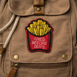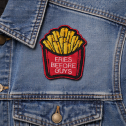 Declare your priorities loud and proud with this cheeky embroidered patch that says what we’re all thinking: fries first, feelings later. Shaped like a classic red chip box bursting with golden fries, this patch is stitched with sass and snack-loving spirit. The bold white lettering makes it clear—romance can wait, but crispy carbs? Never.