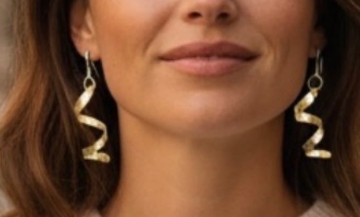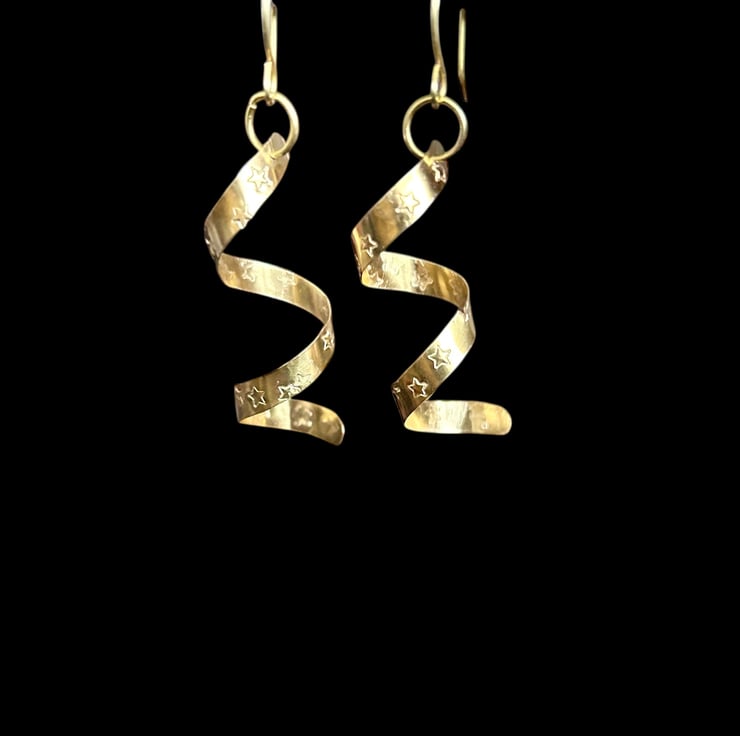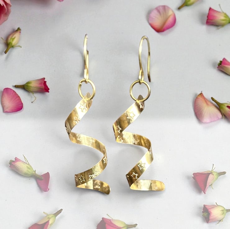 I have made these earrings using solid brass sheet metal which I have cut, sanded, added star symbols, polished and curled into spirals.