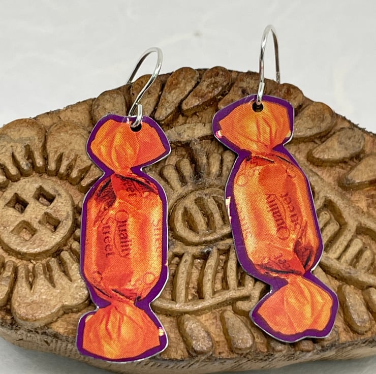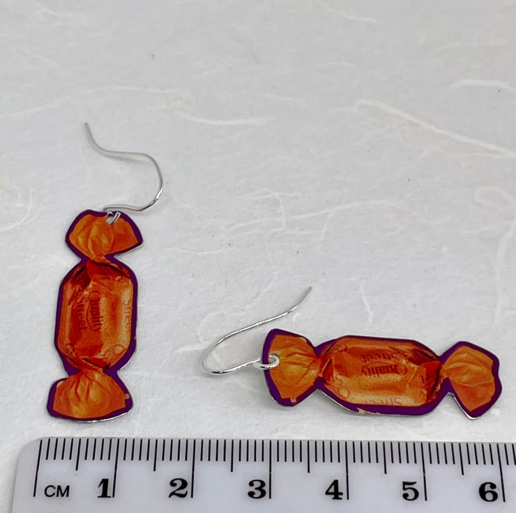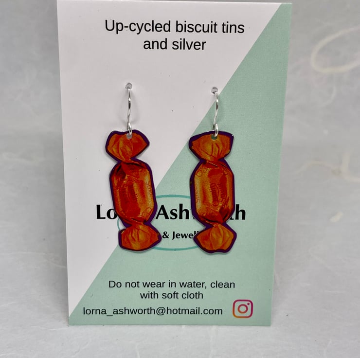 The Orange Cream, yum! These earrings are made from recycled Quality Street tins. There is just the one pair of earrings and they are gently curved so that they hang nicely when worn. They measure approximately 1.2cm wide and 4cm long.