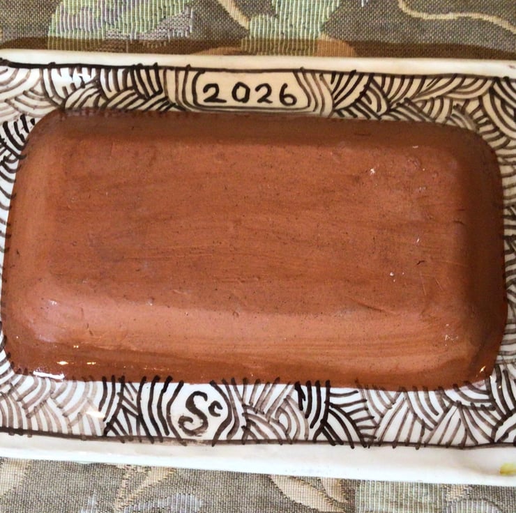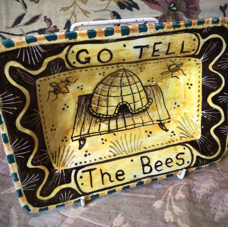 Square dish made from terracotta earthenware, hand decorated with a medieval bee skep design.