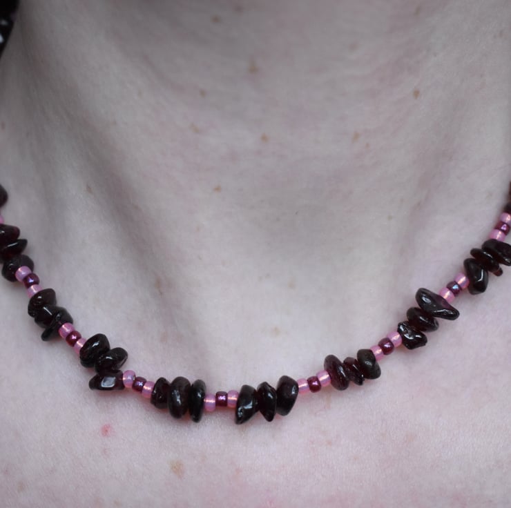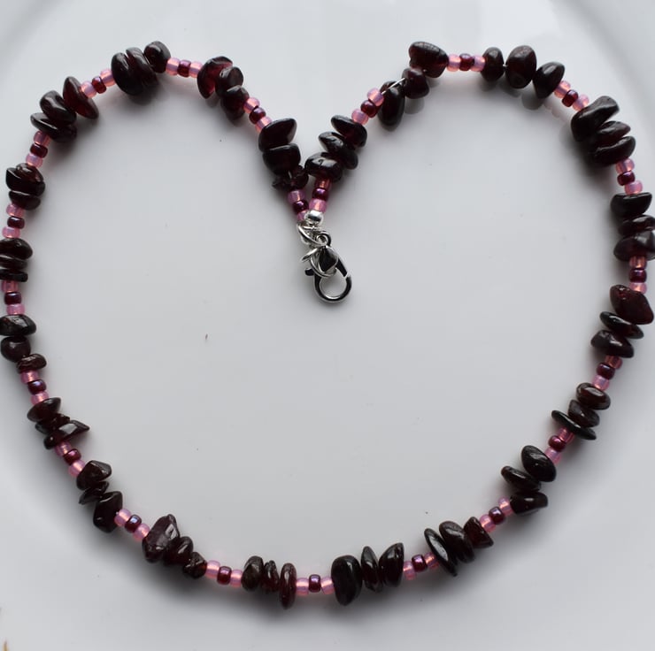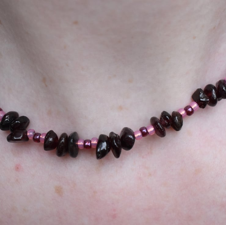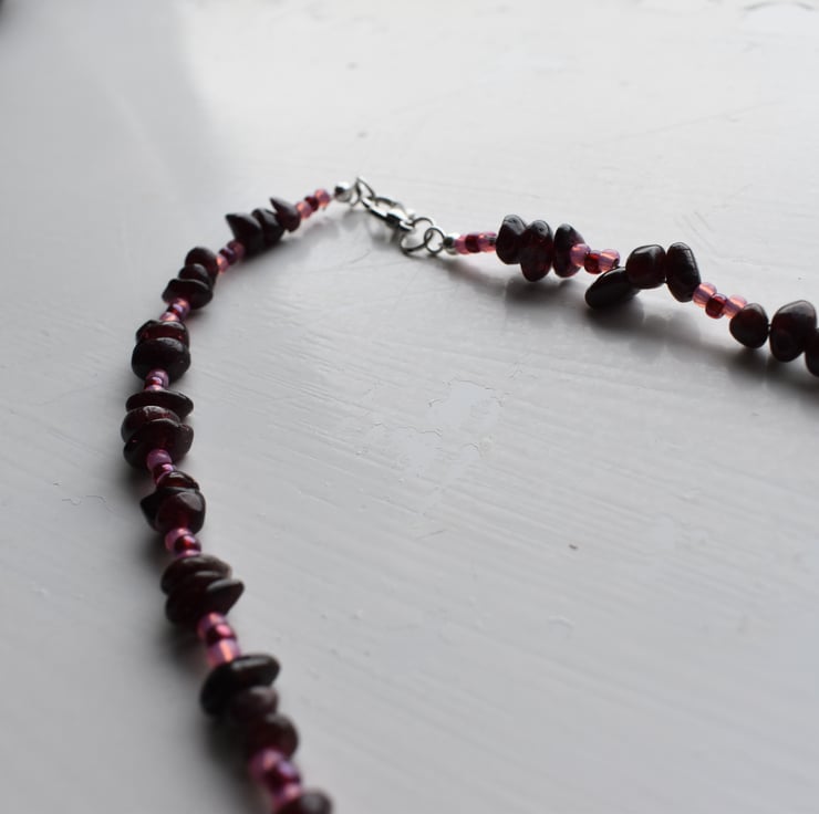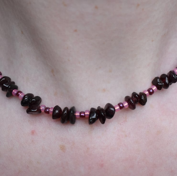 The garnet chips vary naturally in size and shape, giving the necklace an organic, textured feel. Fine Miyuki glass seed beads also used for contrast and detail.