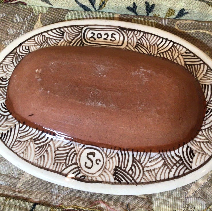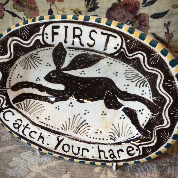 Oval dish made from terracotta earthenware, hand decorated with a running hare design.