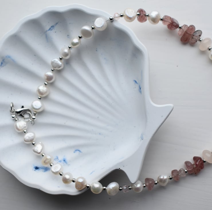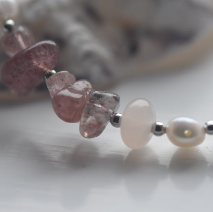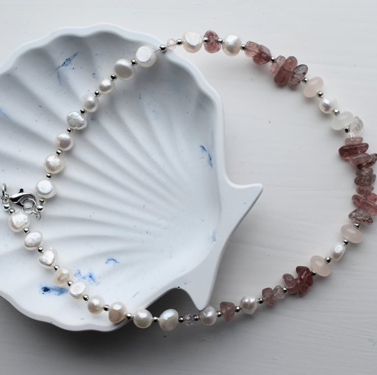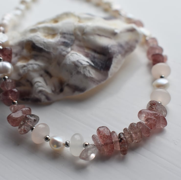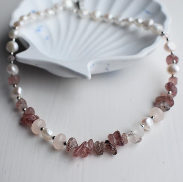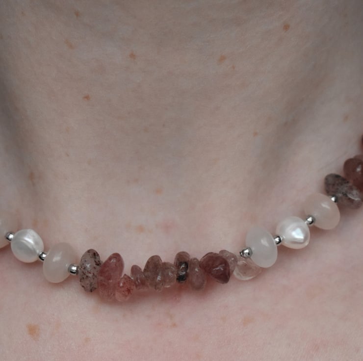 A beautiful necklace combining natural freshwater pearls, strawberry quartz gemstone chips, and small light pink faceted beads. The design alternates carefully between small clusters of pearls, single silver-tone beads, and gemstone chips.