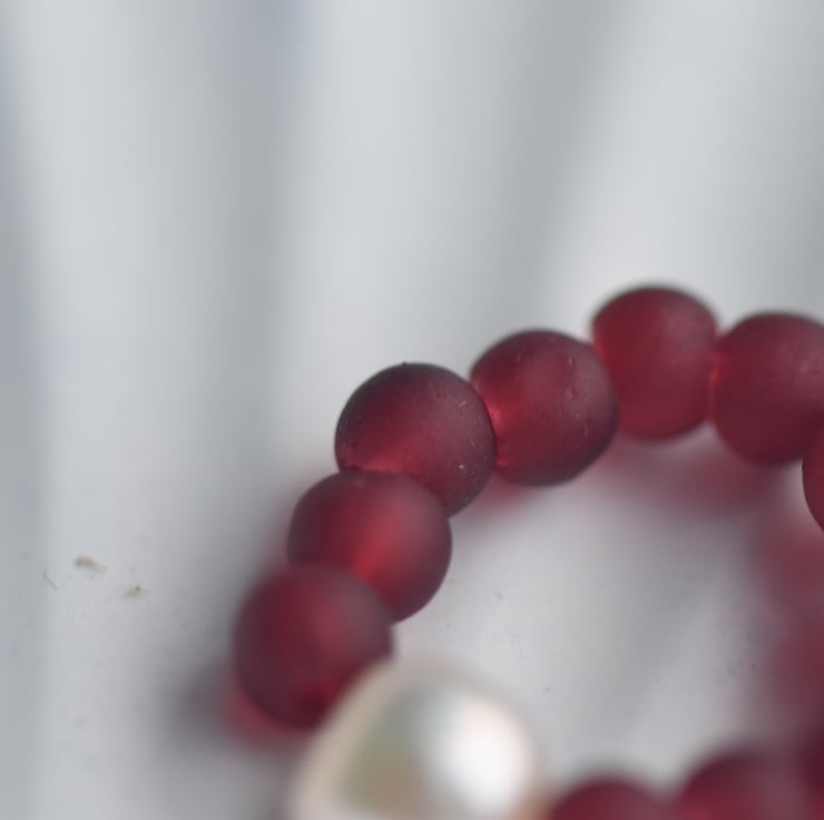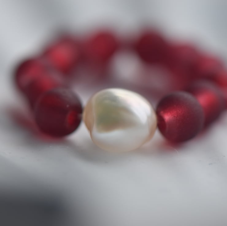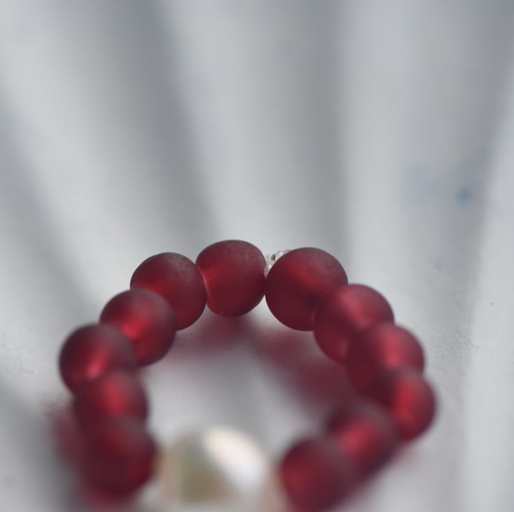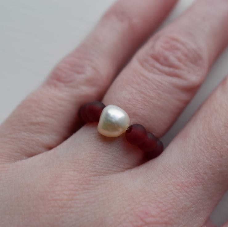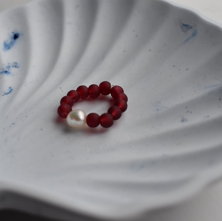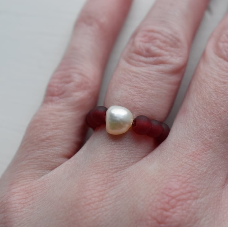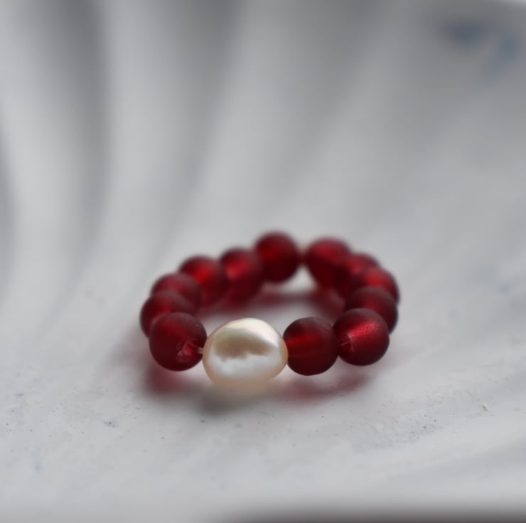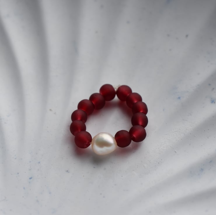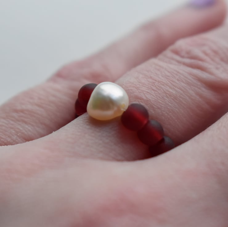 A delicate handmade ring with a single natural freshwater pearl at the centre, surrounded by small red glass beads.