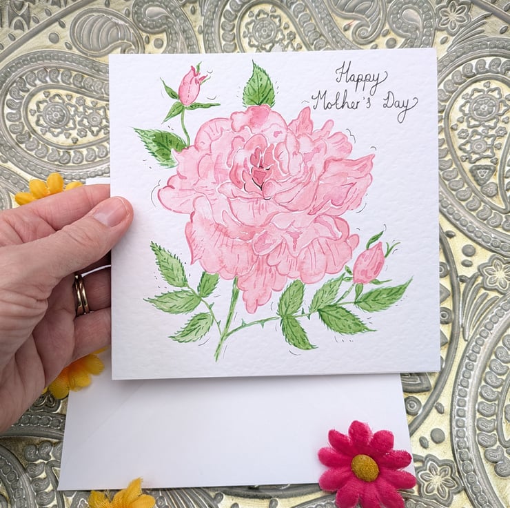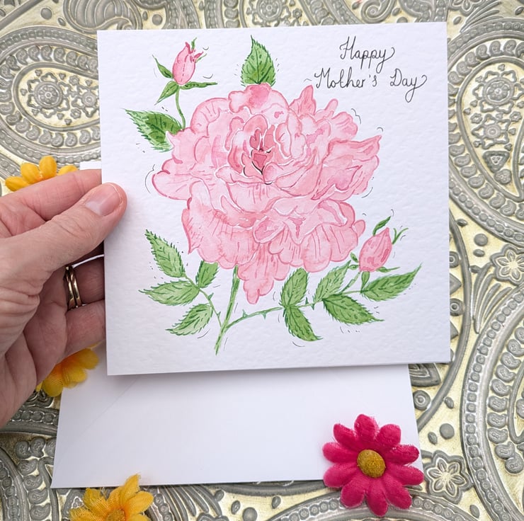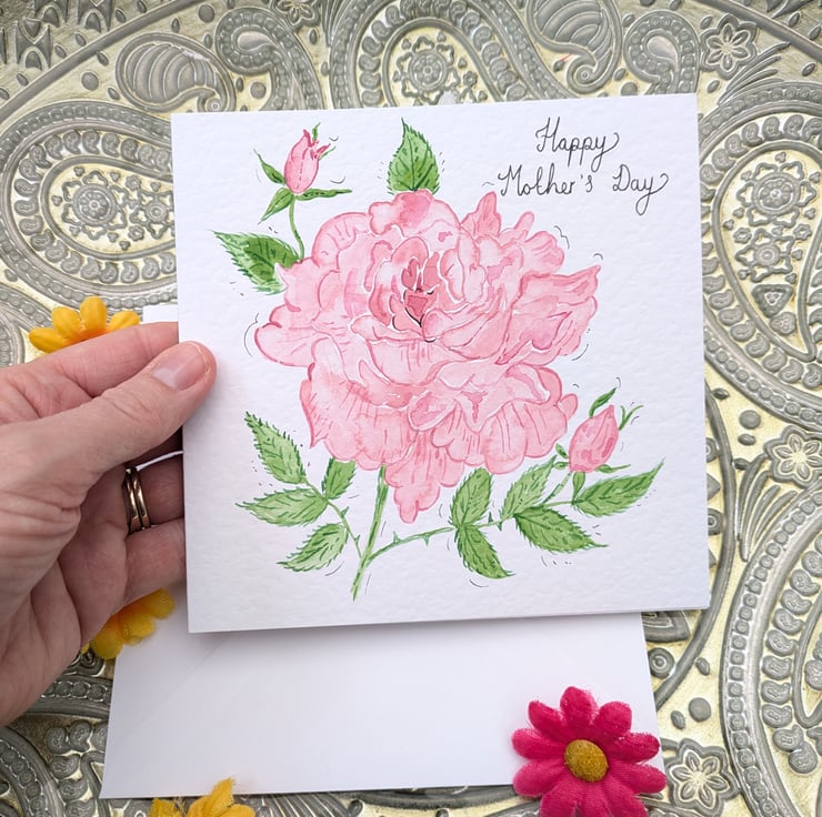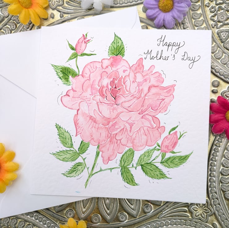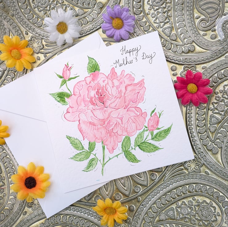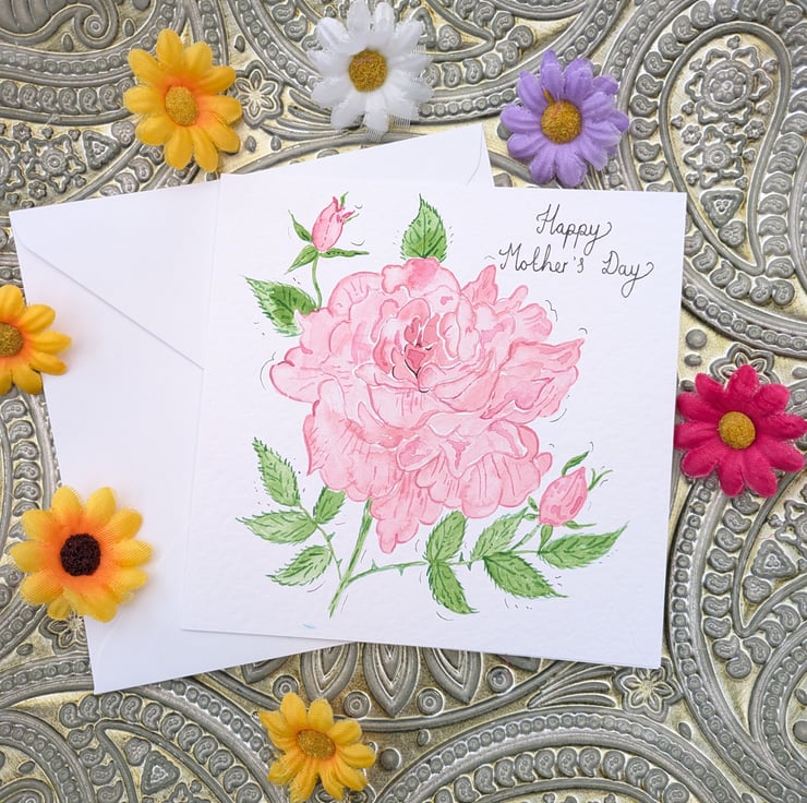 A beautiful hand-painted Pink Rose watercolour floral Mother's day card. A special and unique card ideal for Mother's Day for your Mum, Nan, Nana, Grandma or Gran. Would be lovely to frame afterwards too as a special keepsake.