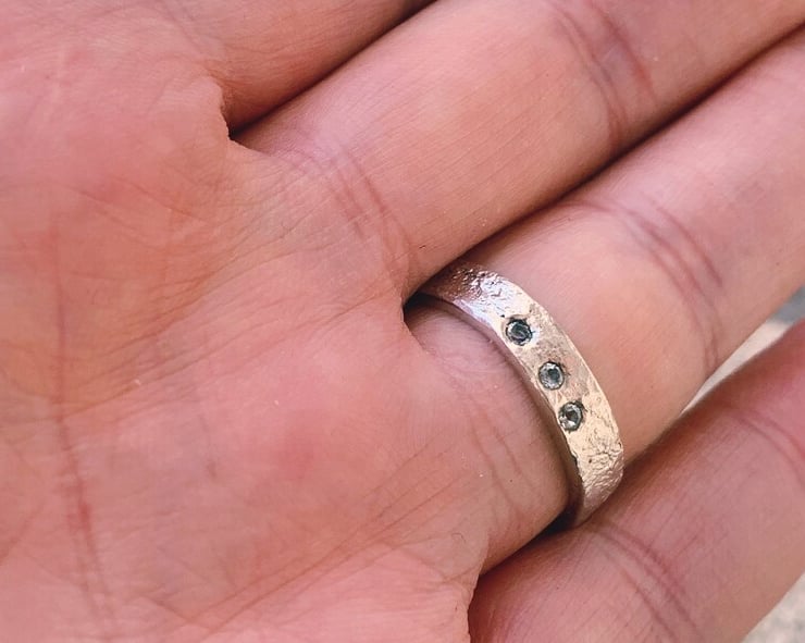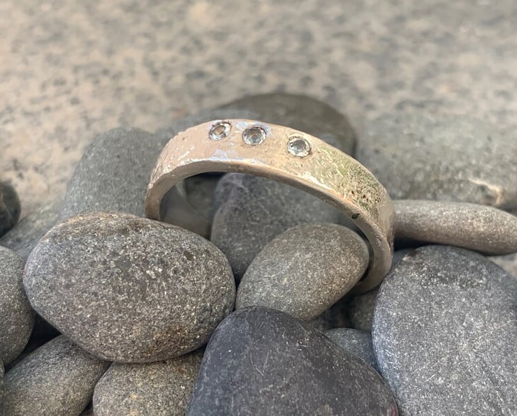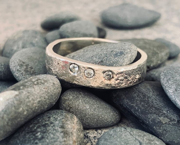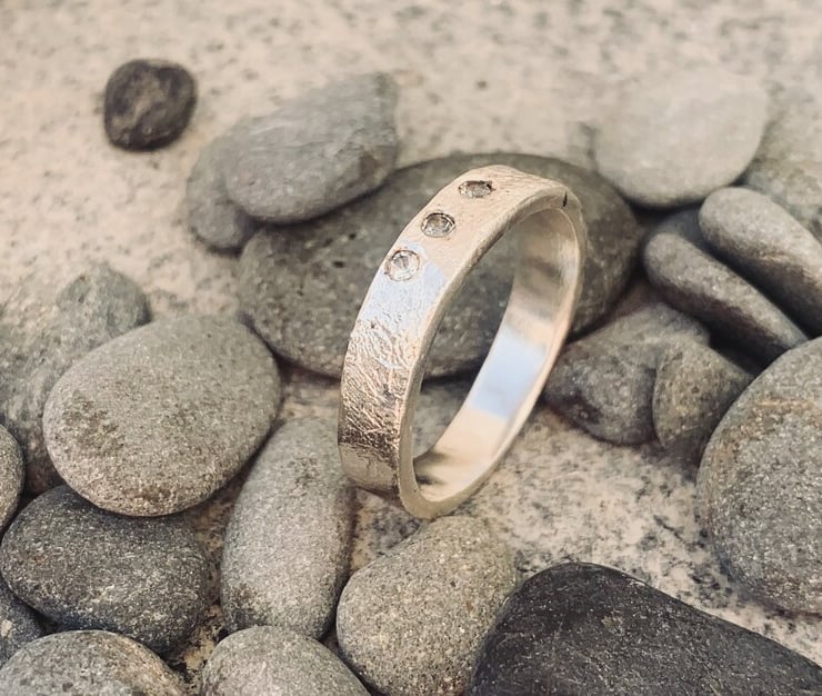 Sterling silver band with a heat flame texture (reticulated) heating the metal until it starts to bubble and breakdown, then immediately take away the flame. The applied texture is unique, tactile and has organic contemporary look.