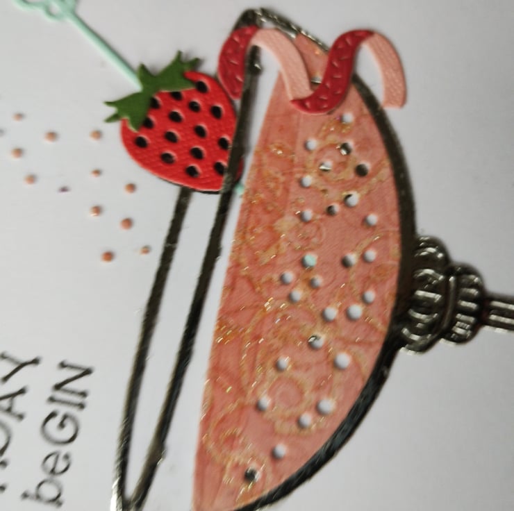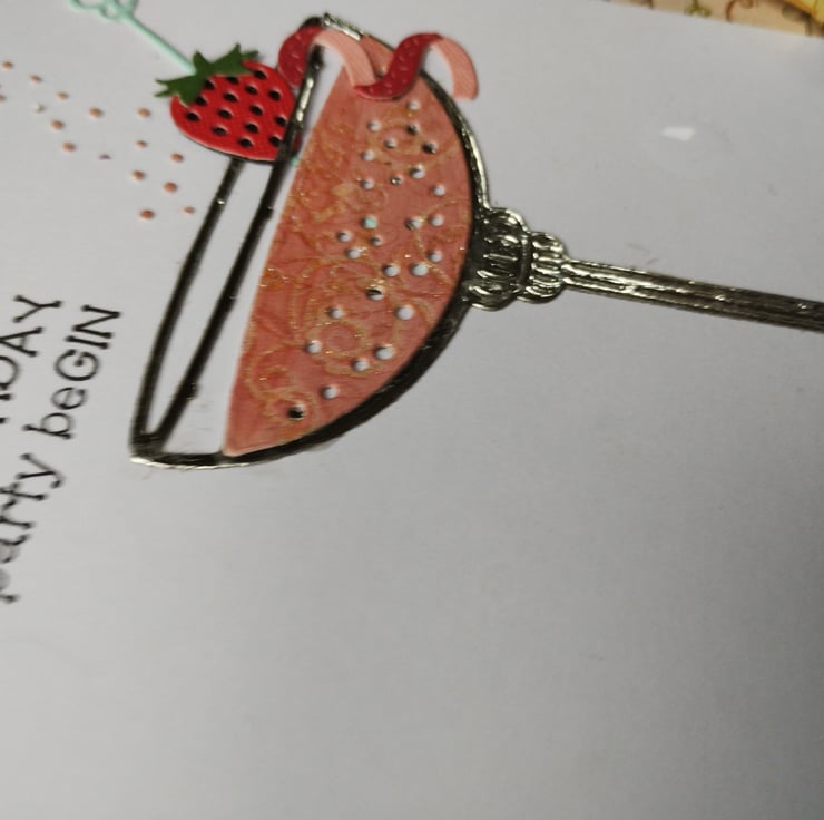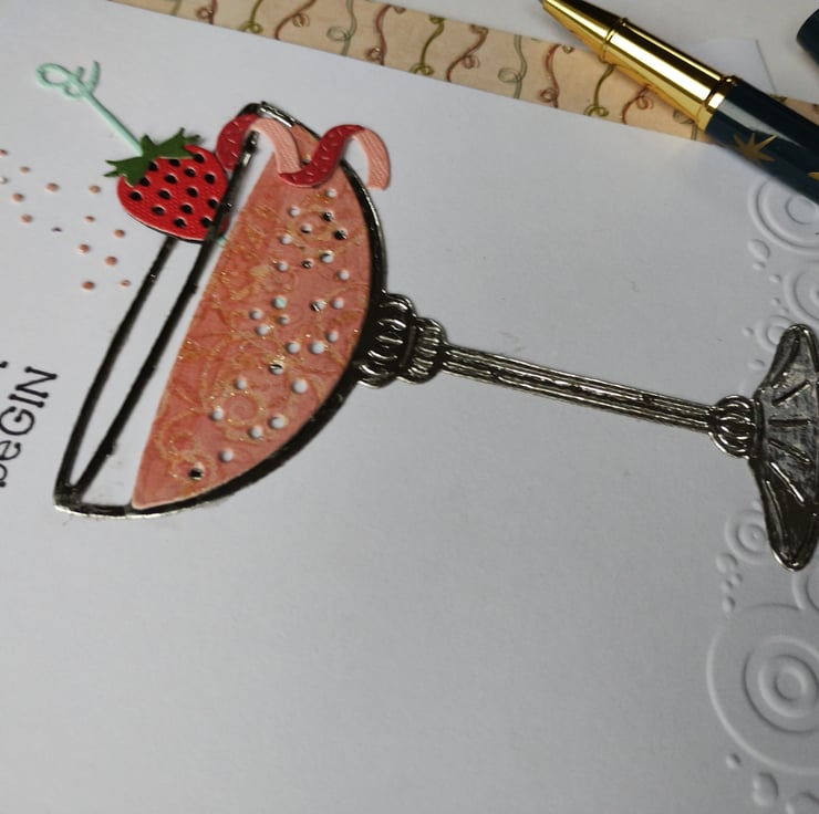 I've cut the glass from super shiny mirri-card and added a glittery pattern paper to resemble the drink. I've cut a strawberry and a curly slice from textured cardstock for the garnish, they are layered for dimension. To add a little further texture I've embossed a line of quirky circle along the bottom of the card. I've also added a strip of shiny patterned paper along the inside of the card to give a little more interest and colour to the design.