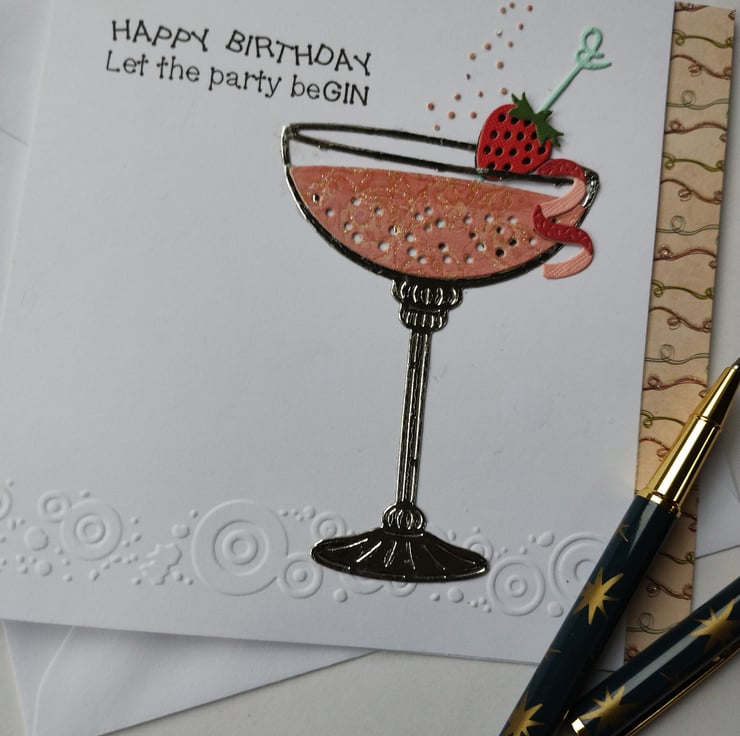 A fabulous glass of pink gin fizz is the focus of this handmade card.