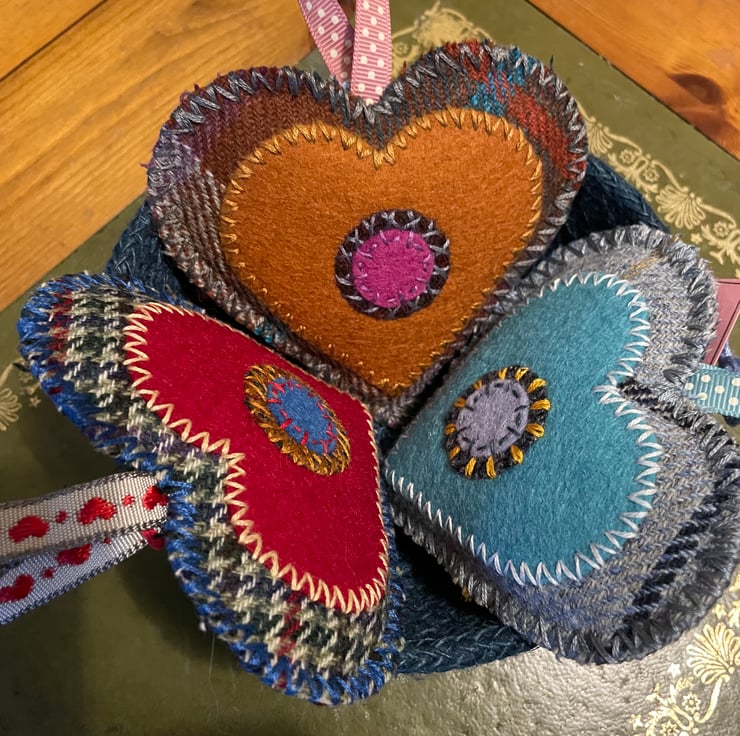 My inspiration for my embroidered heart is my love of Folk Art artefacts and my aim by using traditional methods of hand stitching and embroidery , alongside working with fabrics such as Wool Tweed and Wool Felt to create a modern product reflecting traditional skills and techniques.