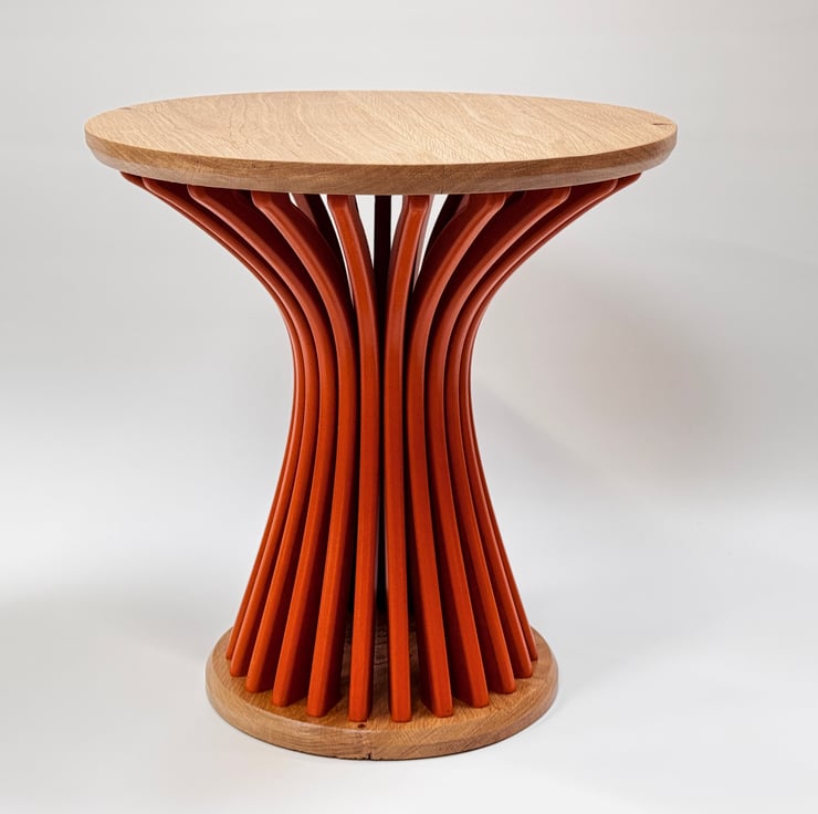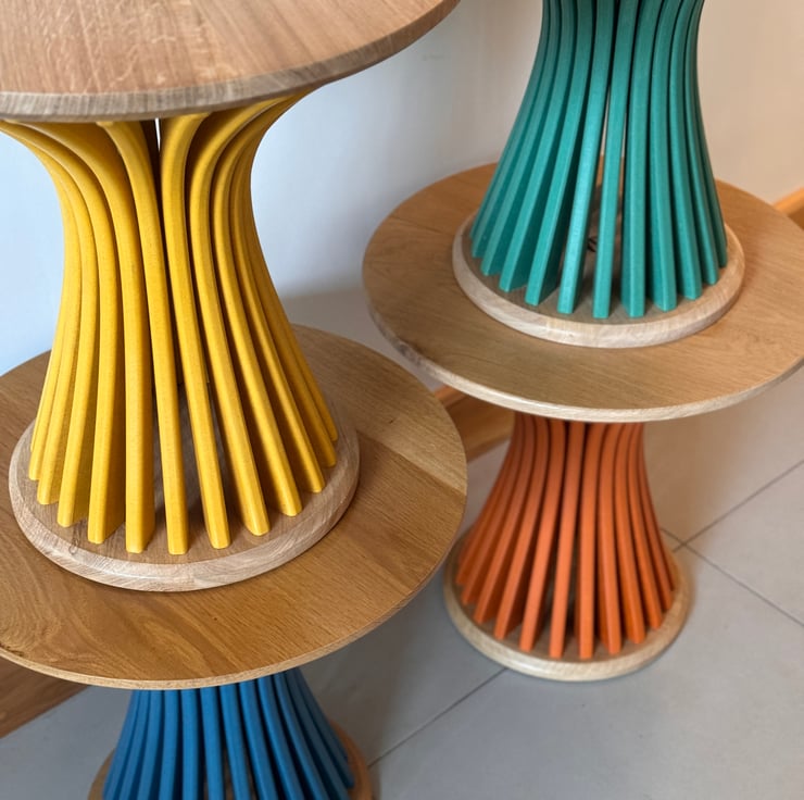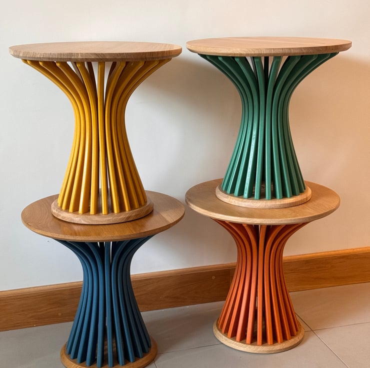 After many years of making bespoke furniture i wanted to design a colourful curvy side table that I could make in batches to spend time refining the design and the process of creating a system in which I could sell beautiful furniture without the high price of one off bespoke builds.
