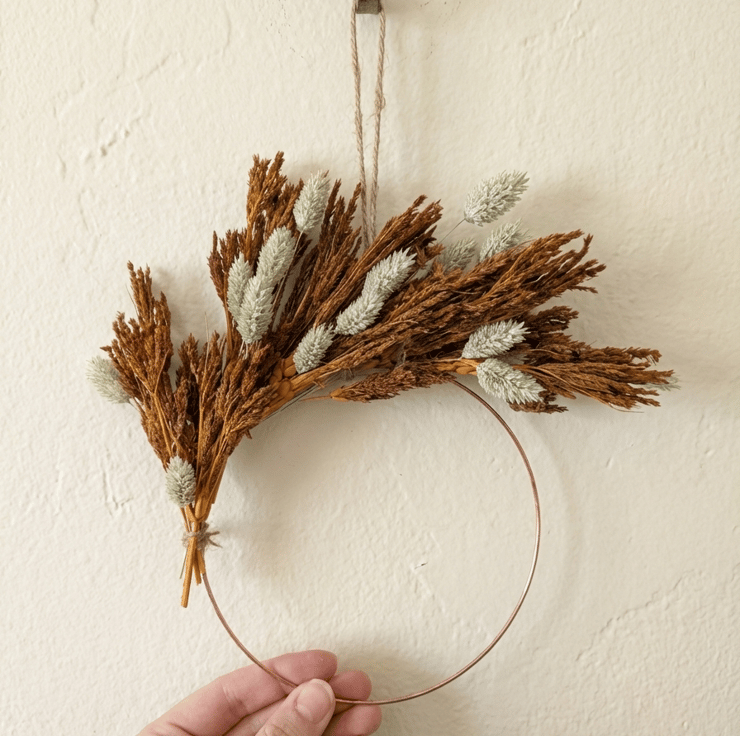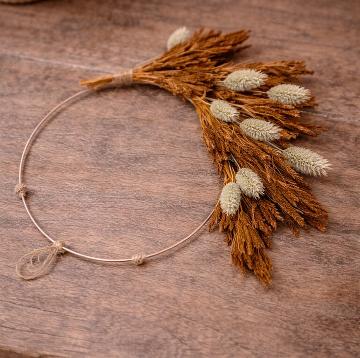 This small dried flower wreath was inspired by slow autumn walks — the kind where the air feels crisp, the ground is scattered with warm tones, and you come home with cold hands and a calm mind. The grasses and florals echo those quiet moments, gathered in colours that feel earthy, soft, and familiar.