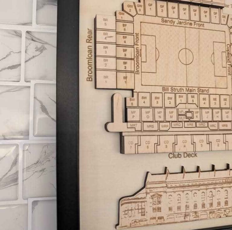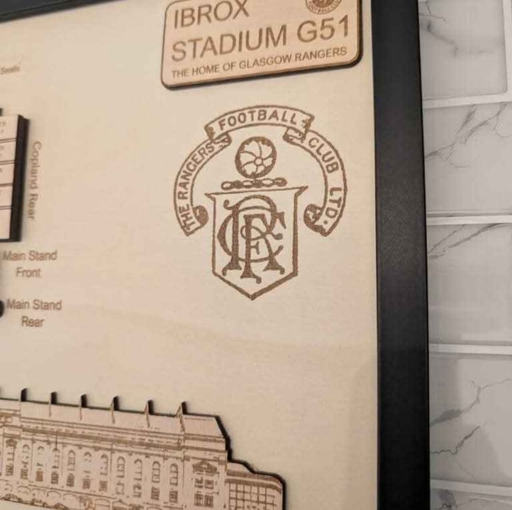 Laser engraved Rangers FC wall plaque featuring a 3D model of Ibrox Stadium seating plan as well as an engraved image of the iconic front facade of this beautiful building. This is the perfect gift for any Rangers fan and will bring a touch of class to any mancave. Other teams available on request.