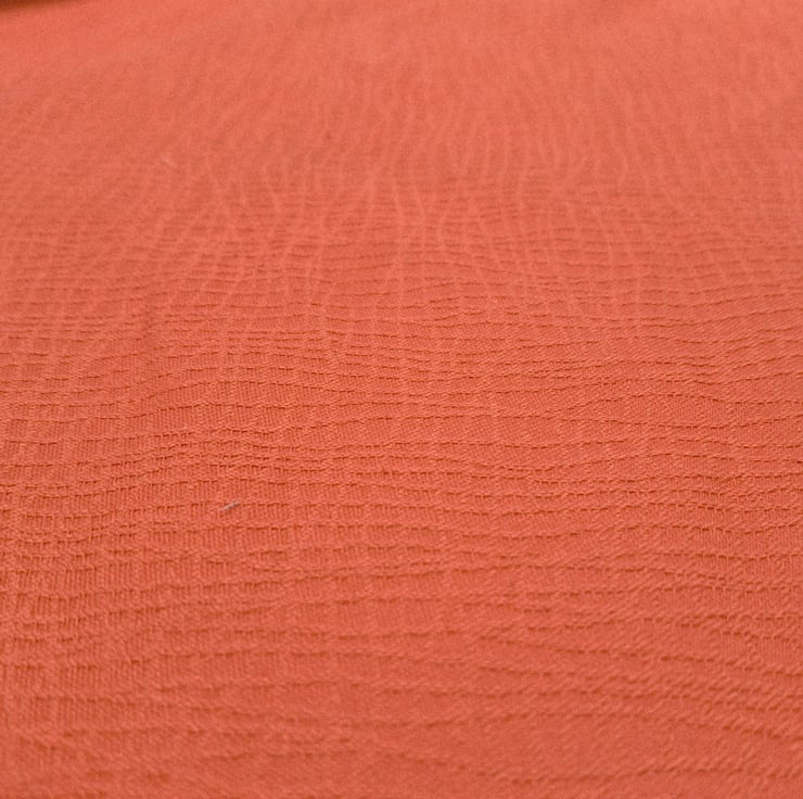 Burnt orange polycotton furnishing fabric with a textured basket weave and irregular grid pattern. The surface has a tactile woven finish with subtle variation in the weave, giving depth and character rather than a flat print