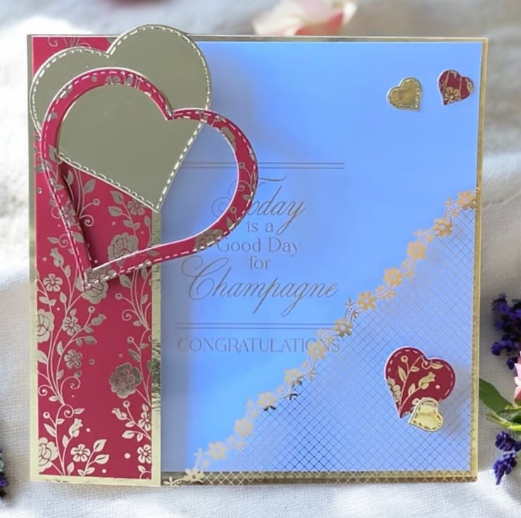 This handmade 6x6 card shines in rich red tones with elegant gold details and layered hearts.