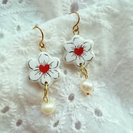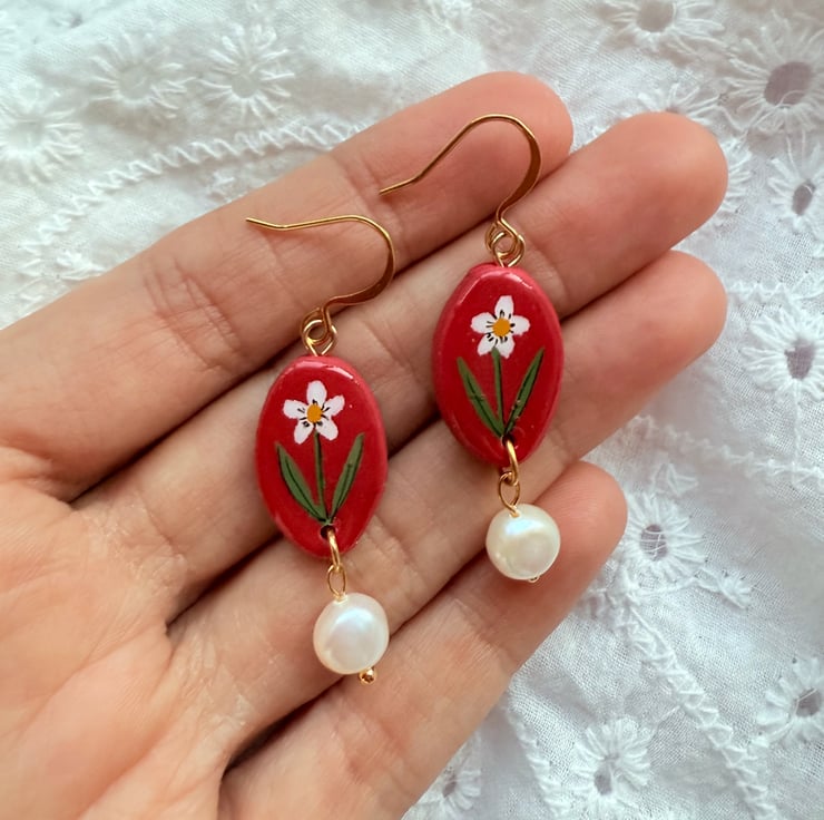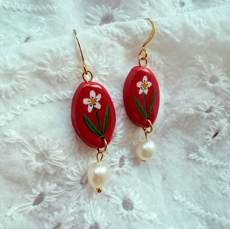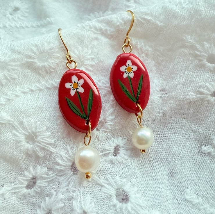 Each earring features a glossy Cherry Red oval polymer clay charm, hand painted with a delicate White daisy and Green leafy details. A natural freshwater pearl drop adds gentle movement and elegance, finished with gold-tone hooks for a warm, classic look.
