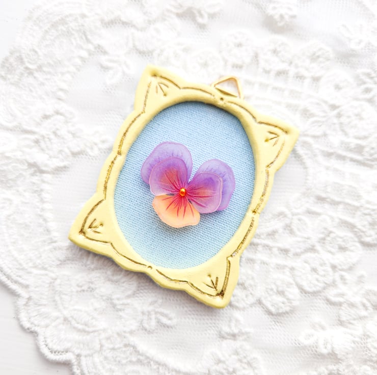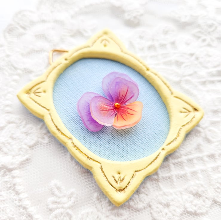 Centre sits a tiny three-dimensional flower made from shrink plastic, carefully hand-coloured and create a delicate form.