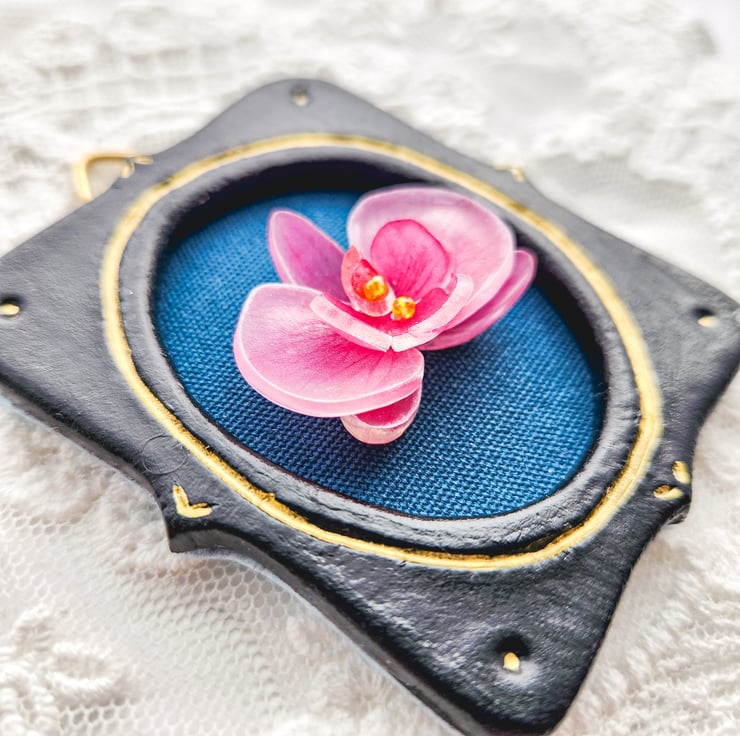 Centre sits a tiny three-dimensional flower made from shrink plastic, carefully hand-coloured and create a delicate form.