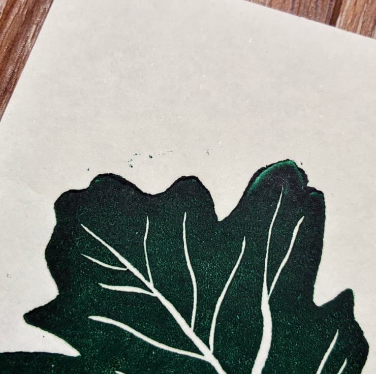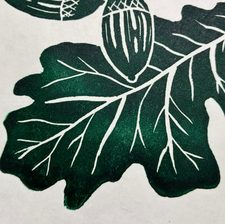 PERFECTLY IMPERFECT Oak leaf and acorn original linocut print in forest green