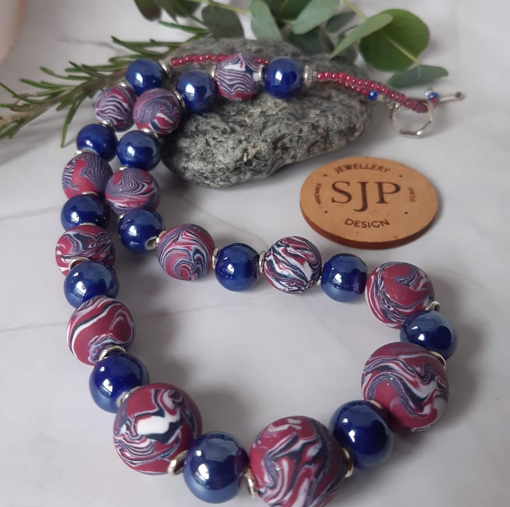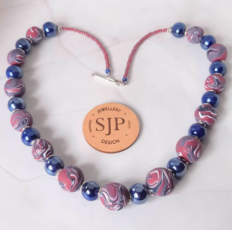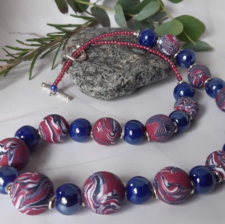 A handmade necklace featuring dark magenta, navy and white polymer clay in a unique swirl design. Each bead is individually handcrafted, making every piece a unique piece of jewellery.
