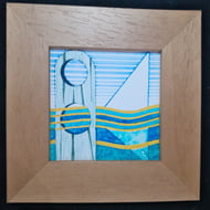 An original miniature of turquoise and gold ginkgo leaves in a black fame. The leaves have been created using watercolour brush pens and goldr metallic pen. The overall size is 13cm(h) x 13cm (w).
