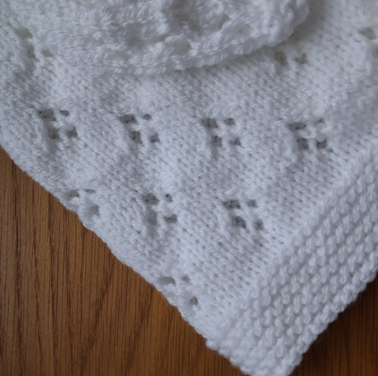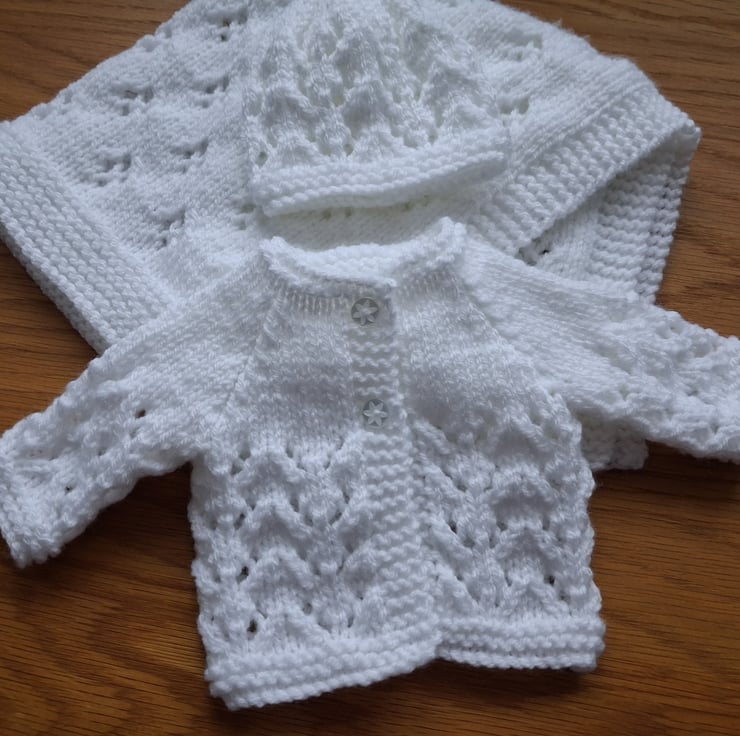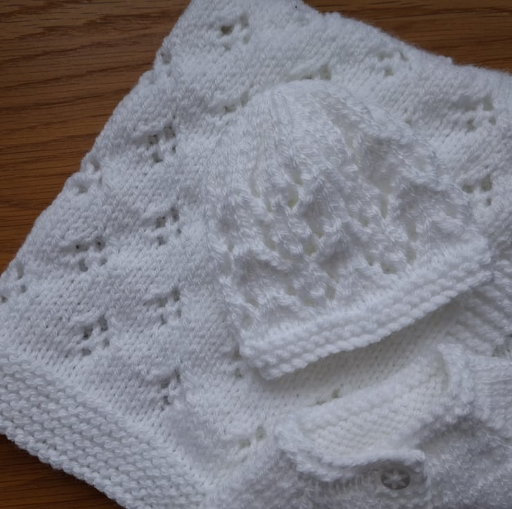 This is a set of hand knitted White blanket, hat and jacket for a 14/15" doll. The jacket is fastened with two star buttons.