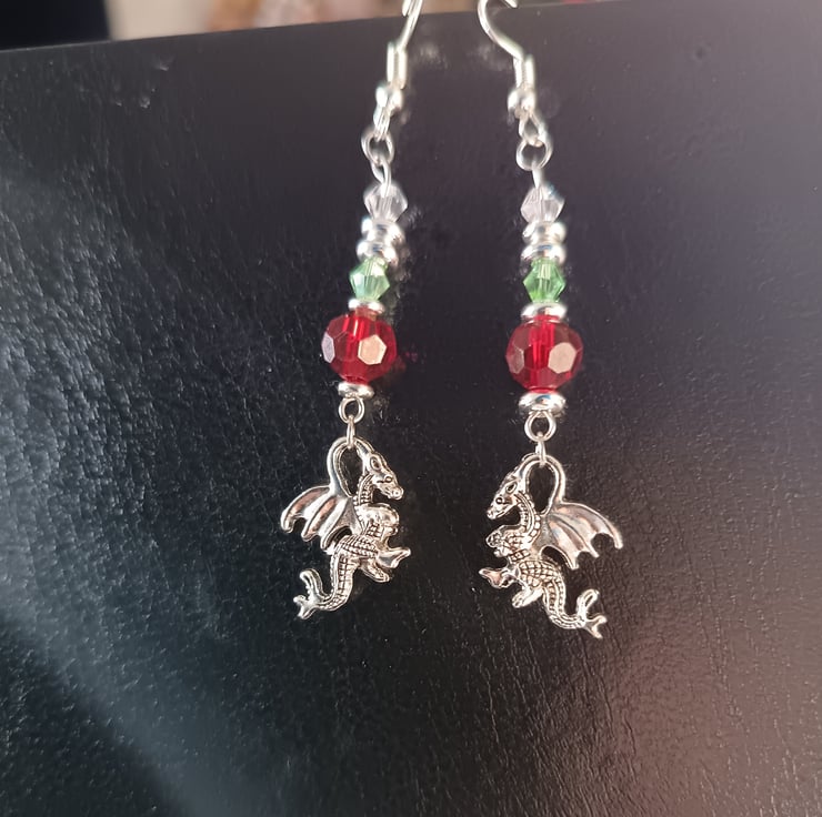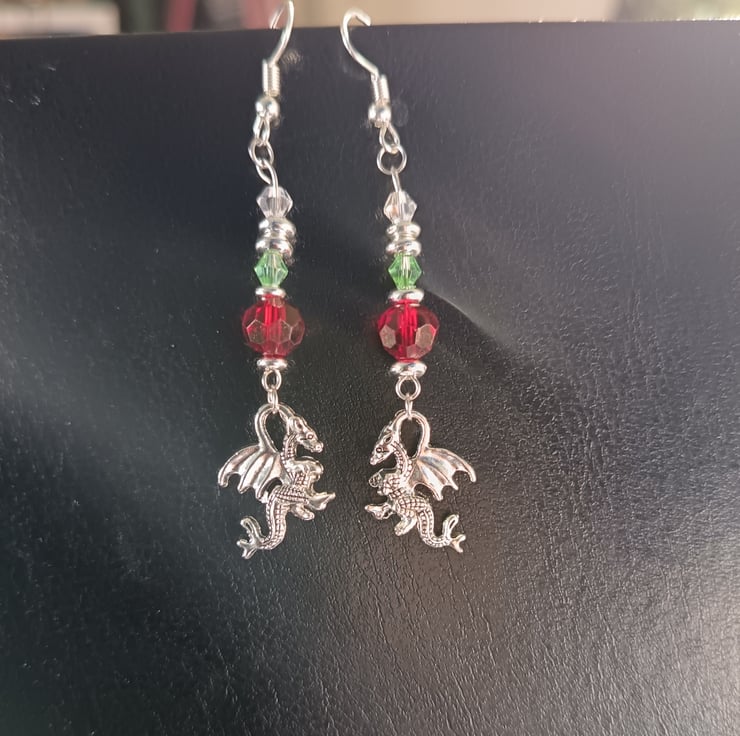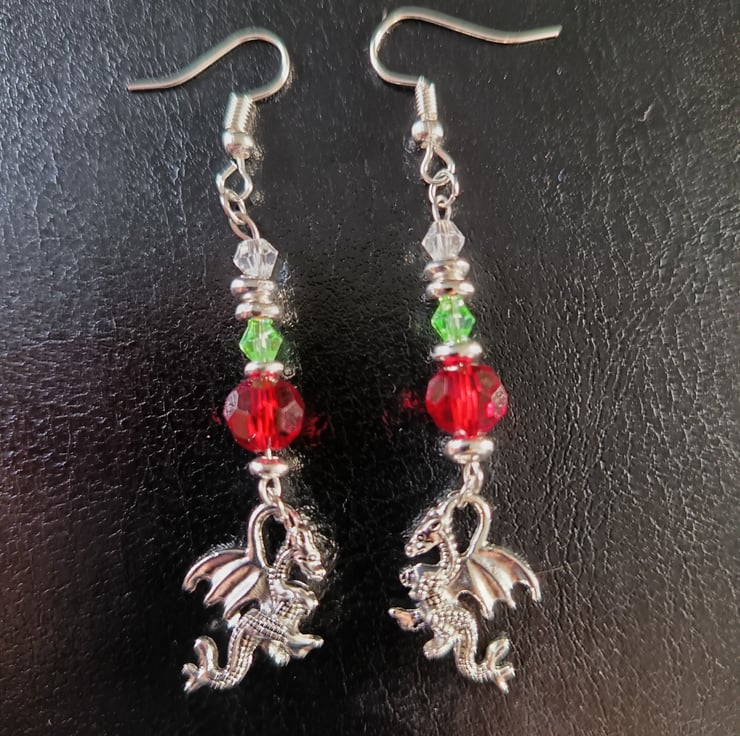 These handmade earrings are crafted with stainless steel hooks, stainless steel silver dragon charms, silver decorative spacers and glass beads in red, green and clear colours.
